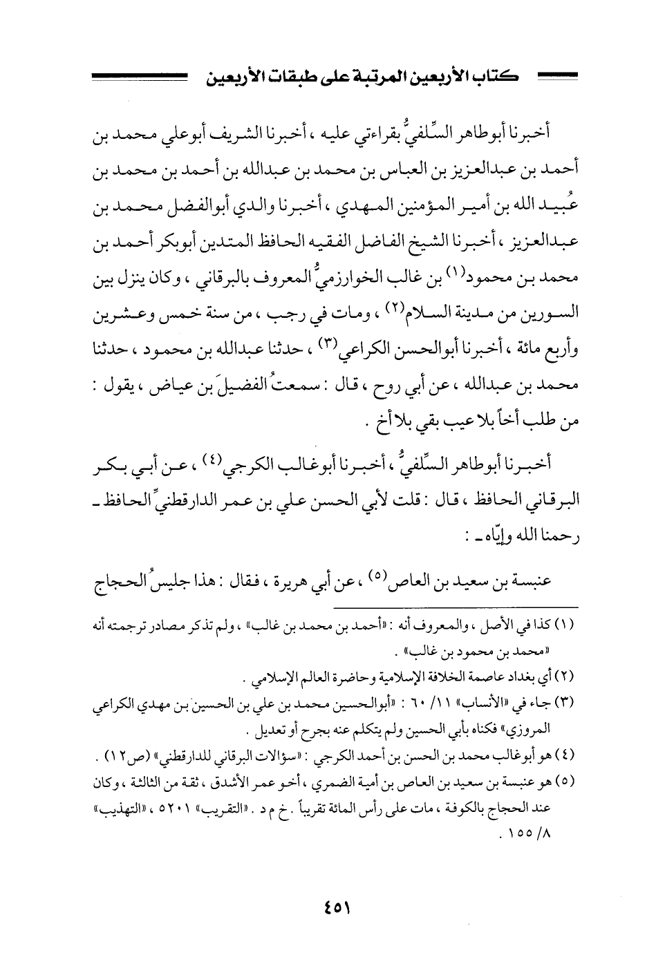 أخبرنا أبو طاهر السلفي بقراءتي عليه، أخبرنا الشريف أبو علي محمد بن أحمد بن عبد العزيز بن العباس بن محمد بن عبد الله بن أحمد بن محمد بن عبيد الله بن أمير المؤمنين المهدي، أخبرنا والدي أبو الفضل محمد بن عبد العزيز، أخبرنا الشيخ الفاضل الفقيه الحافظ المتدين أبو بكر أحمد بن محمد بن محمود بن غالب الخوارزمي المعروف بالبرقاني، وكان ينزل بين السورين من مدينة السلام، ومات في رجب، من سنة خمس وعشرين وأربع مائة، أخبرنا أبو الحسن الكراعي، حدثنا عبد الله بن محمود، حدثنا محمد بن عبد الله، عن أبي روح، قال: سمعت الفضيل بن عياض، يقول: من طلب أخاً بلا عيب بقي بلا أخ.