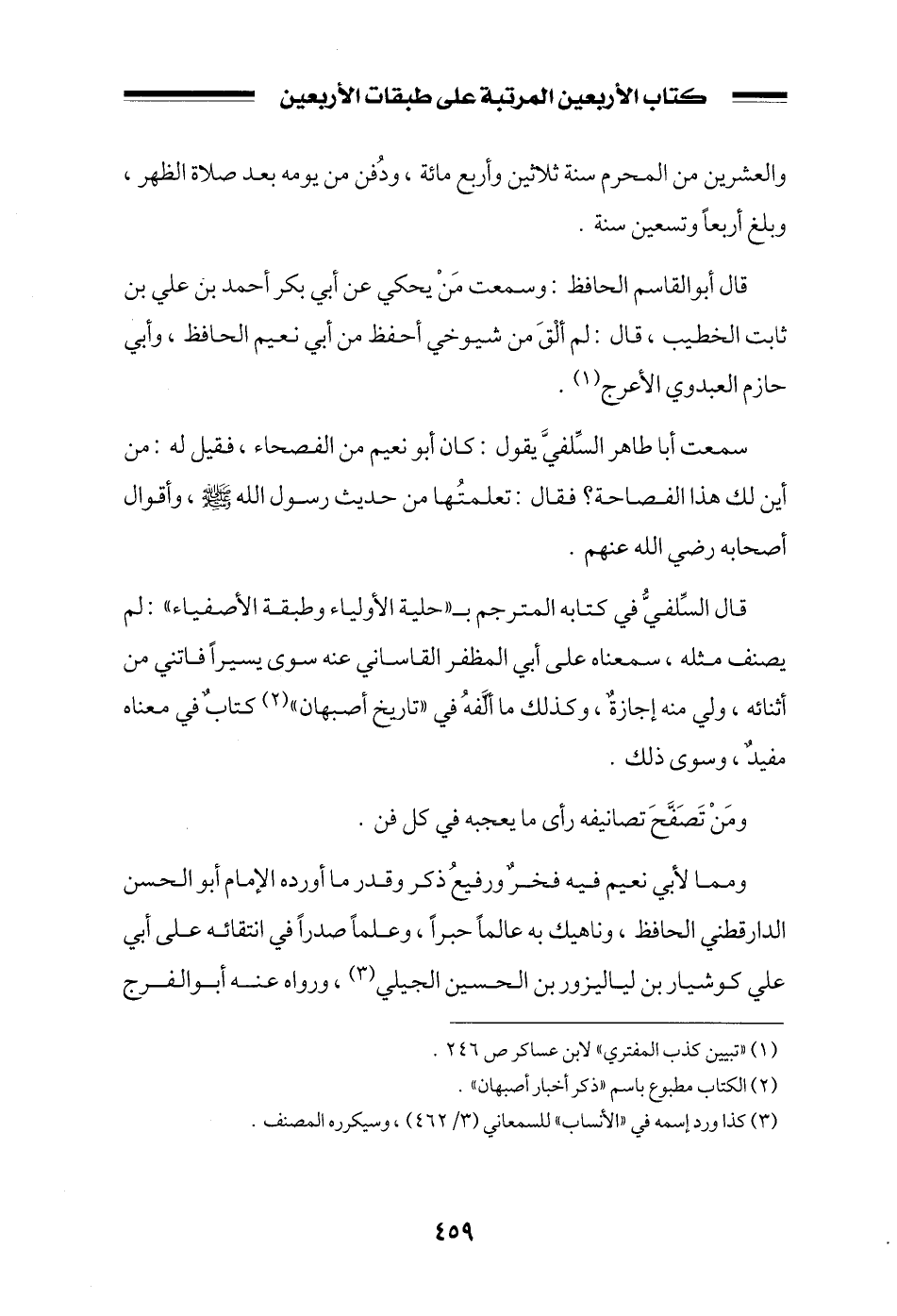 ومما لأبي نعيم فيه فخرٌ ورفيع ذكر وقدر ما أورده الإمام أبو الحسن الدارقطني الحافظ، وناهيك به عالماً حبراً، وعلماً صدراً في انتقائه على أبي علي كوشيار بن لياليزور بن الحسين الجيلي، ورواه عنه أبو الفرج