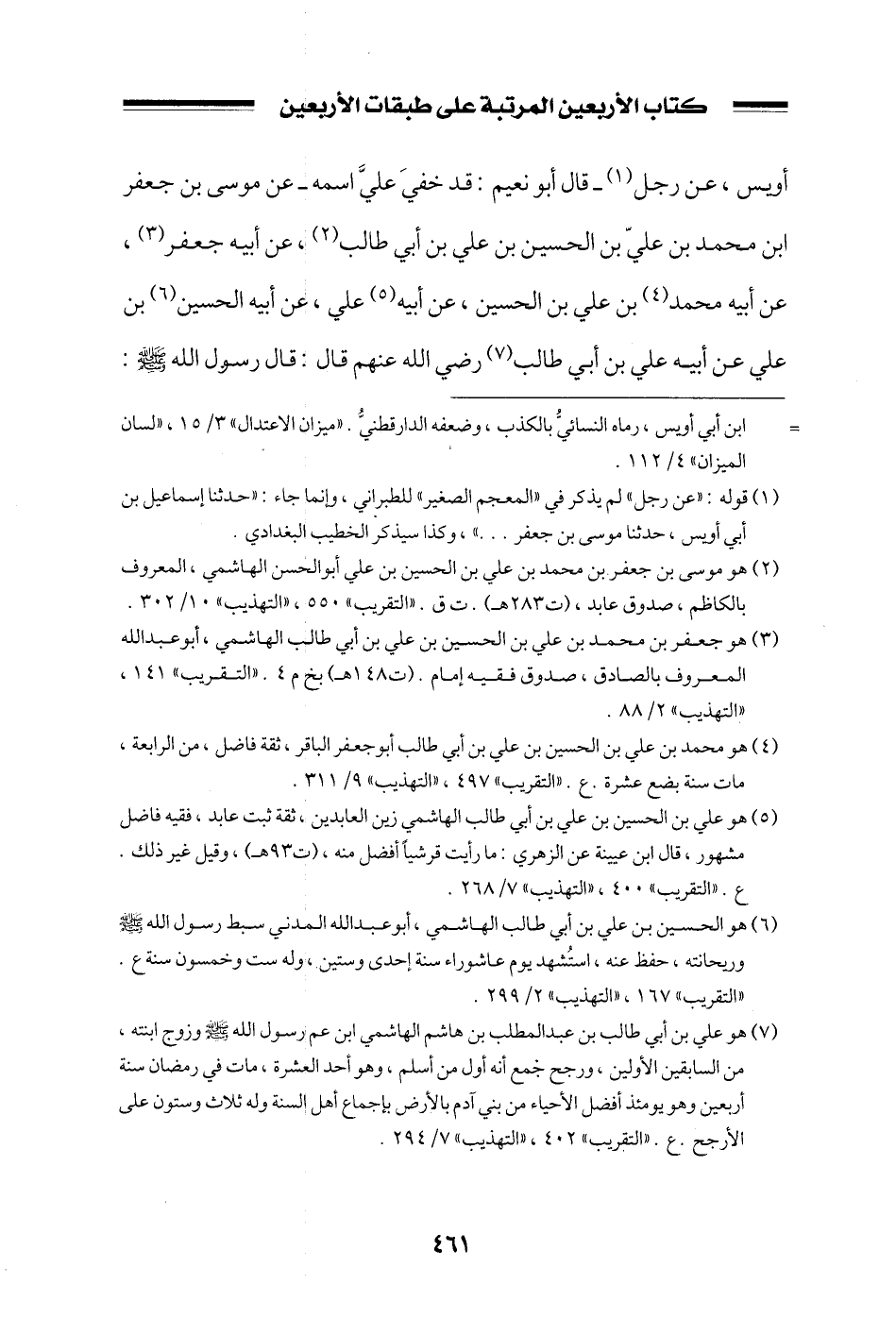 أويس، عن رجل -قال أبو نعيم: وقد خفي علي اسمه- عن موسى بن جعفر ابن محمد بن علي بن الحسين بن علي بن أبي طالب، عن أبيه جعفر، عن أبيه محمد بن علي بن الحسين، عن أبيه علي، عن أبيه الحسين بن علي عن أبيه علي بن أبي طالب رضي الله عنهم قال: قال رسول الله صلى الله عليه وسلم: