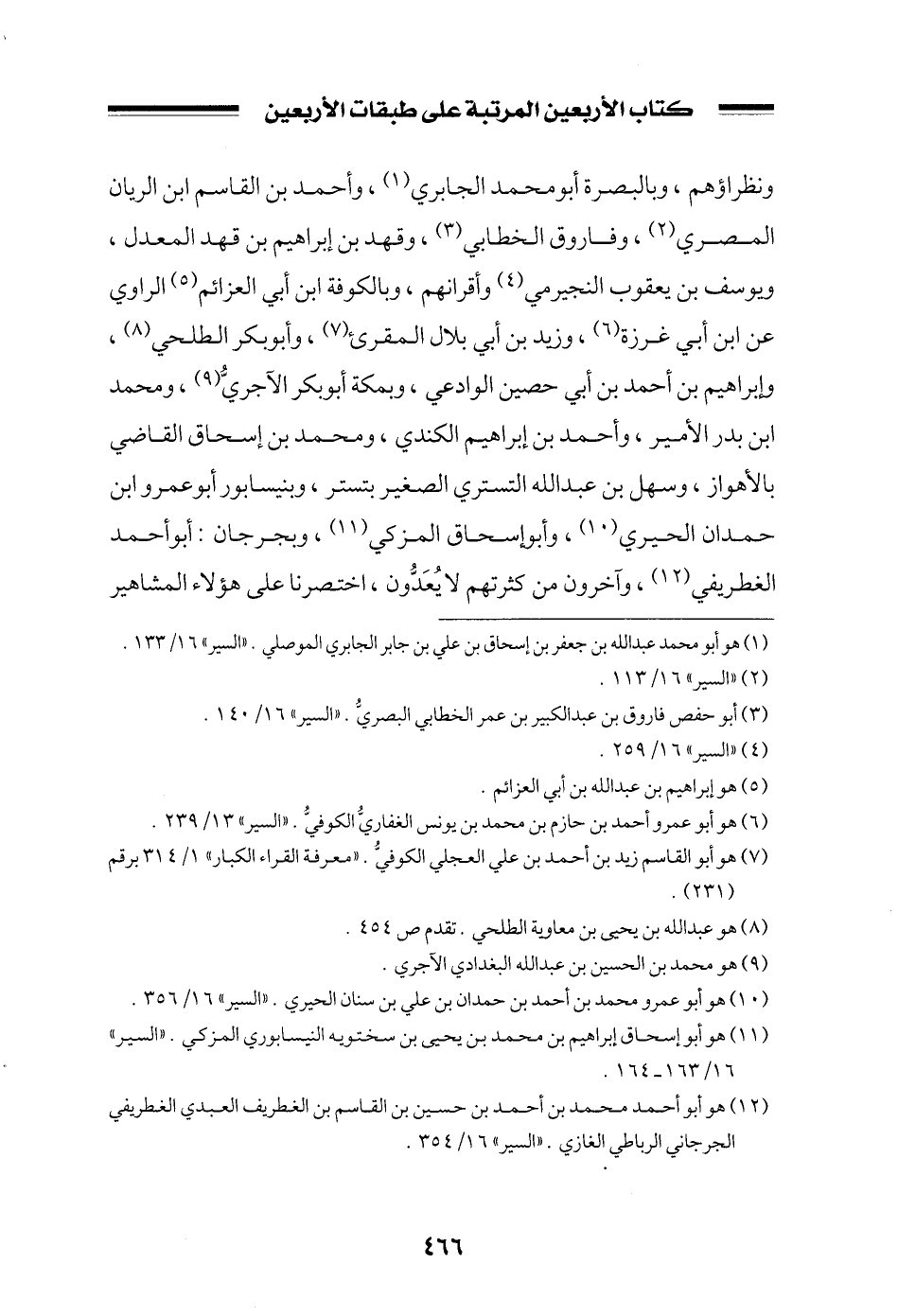 ونظراؤهم، وبالبصرة أبو محمد الجابري، وأحمد بن القاسم ابن الريان المصري، وفاروق الخطابي، وقهد بن إبراهيم بن قهد المعدل، ويوسف بن يعقوب النجيرمي وأقرانهم، وبالكوفة ابن أبي العزائم الراوي عن ابن أبي غرزة، وزيد بن أبي بلال المقرئ، وأبو بكر الطلحي، وإبراهيم بن أحمد بن أبي حصين الوادعي، وبمكة أبو بكر الآجري، ومحمد ابن بدر الأمير، وأحمد بن إبراهيم الكندي، ومحمد بن إسحاق القاضي بالأهواز، وسهل بن عبد الله التستري الصغير بتستر، وبنيسابور أبو عمرو ابن حمدان الحيري، وأبو إسحاق المزكي، وبجرجان: أبو أحمد الغطريفي، وآخرون من كثرتهم لا يعدون، اختصرنا على هؤلاء المشاهير