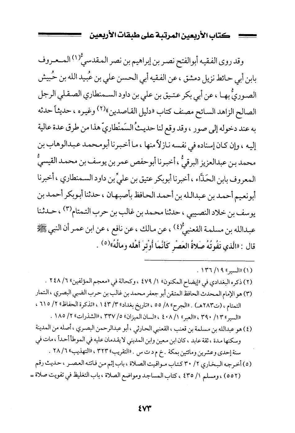 وقد روى الفقيه أبو الفتح نصر بن إبراهيم بن نصر المقدسي المعروف بابن أبي حائط نزيل دمشق، عن الفقيه أبي الحسن علي بن عبيد الله بن حبيش الصوري بها، عن أبي بكر عتيق بن علي بن داود السمنطاري الصقلي الرجل الصالح الزاهد السائح مصنف كتاب ((دليل القاصدين)) وغيره، حديثاً حدثه به عند دخوله إلى صور، وقد وقع لنا حديث السمنطاري هذا من طرق عدة عالية إليه، وإن كان إسناده في نفسه نازلاً منها، ما أخبرنا أبو محمد عبد الوهاب بن محمد بن عبد العزيز البرقي، أخبرنا أبو حفص عمر بن يوسف بن محمد القيسي المعروف بابن الحذاء، أخبرنا أبو بكر عتيق بن علي بن داود السمنطاري، أخبرنا أبو نعيم أحمد بن عبد الله بن أحمد الحافظ بأصبهان، حدثنا أبو بكر أحمد بن يوسف بن خلاد النصيبي، حدثنا محمد بن غالب بن حرب التمتام، حدثنا عبد الله بن مسلمة القعنبي، عن مالك، عن نافع، عن ابن عمر أن النبي صلى الله عليه وسلم قال: ((الذي تفوته صلاة العصر كأنما أوتر أهله وماله)) .
