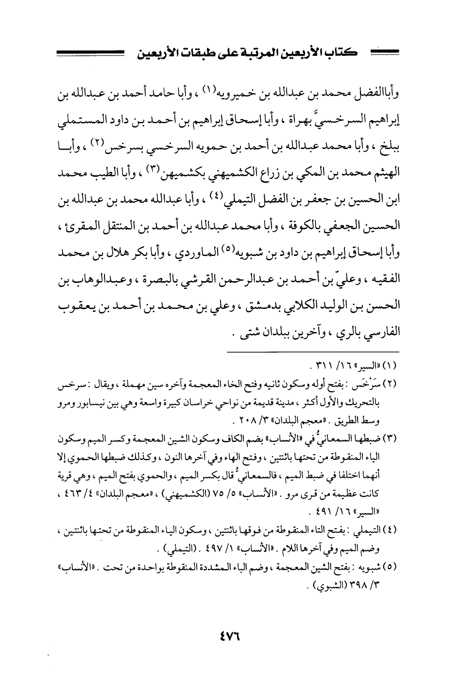 وأبا الفضل محمد بن عبد الله بن خميرويه، وأبا حامد أحمد بن عبد الله بن إبراهيم السرخسي بهراة، وأبا إسحاق إبراهيم بن أحمد بن داود المستملي ببلخ، وأبا محمد عبد الله بن أحمد بن حمويه السرخسي بسرخس، وأبا الهيثم محمد بن المكي بن زراع الكشميهني بكشميهن، وأبا الطيب محمد ابن الحسين بن جعفر بن الفضل التيملي، وأبا عبد الله محمد بن عبد الله بن الحسين الجعفي بالكوفة، وأبا محمد عبد الله بن أحمد بن المنتقل المقرئ، وأبا إسحاق إبراهيم بن داود بن شبويه الماوردي، وأبا بكر هلال بن محمد الفقيه، وعلي بن أحمد بن عبد الرحمن القرشي بالبصرة، وعبد الوهاب بن الحسن بن الوليد الكلابي بدمشق، وعلي بن محمد بن أحمد بن يعقوب الفارسي بالري، وآخرين ببلدان شتى.