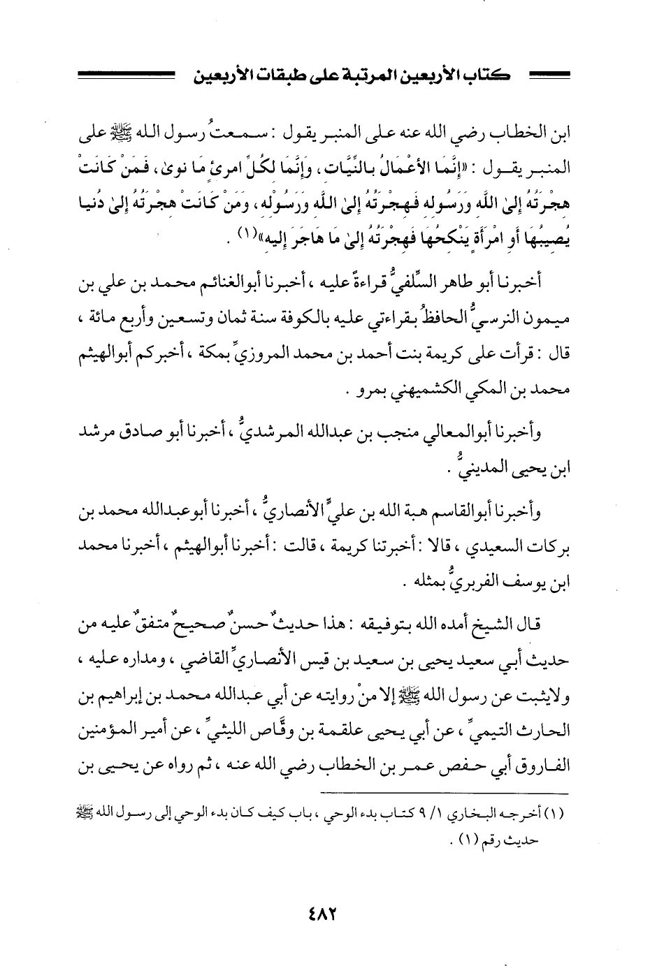 قال الشيخ أمده الله بتوفيقه: هذا حديثٌ حسنٌ صحيحٌ متفقٌ عليه من حديث أبي سعيد يحيى بن سعيد بن قيس الأنصاري القاضي، ومداره عليه، ولا يثبت عن رسول الله صلى الله عليه وسلم إلا من روايته عن أبي عبد الله محمد بن إبراهيم بن الحارث التيمي، عن أبي يحيى علقمة بن وقاص الليثي، عن أمير المؤمنين الفاروق أبي حفص عمر بن الخطاب رضي الله عنه، ثم رواه عن يحيى بن