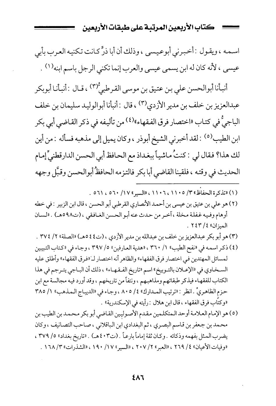 أنبأنا أبو الحسن علي بن عتيق بن موسى القرطبي، قال: أنبأنا أبو بكر عبد العزيز بن خلف بن مدير الأزدي، قال: أنبأنا أبو الوليد سليمان بن خلف الباجي في كتاب ((اختصار فرق الفقهاء)) من تأليفه في ذكر القاضي أبي بكر ابن الطيب: لقد أخبرني الشيخ أبو ذر، وكان يميل إلى مذهبه فسأله: من أين لك هذا؟ فقال لي: كنت ماشياً ببغداذ مع الحافظ أبي الحسن الدارقطني إمام الحديث في وقته، فلقينا القاضي أبا بكر فالتزمه الحافظ أبو الحسن وقبل وجهه