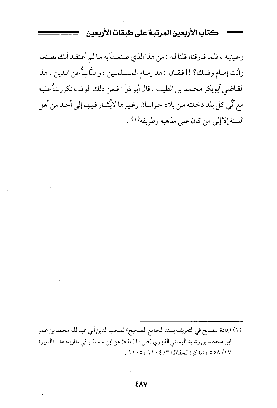 وعينيه، فلما فارقناه قلنا له: من هذا الذي صنعت به ما لم أعتقد أنك تصنعه وأنت إمام وقتك؟! فقال: هذا إمام المسلمين، والذاب عن الدين، هذا القاضي أبو بكر محمد بن الطيب. قال أبو ذر: فمن ذلك الوقت تكررت عليه مع أني كل بلد دخلته من بلاد خراسان وغيرها لا يشار فيها إلى أحد من أهل السنة إلا إلى من كان على مذهبه وطريقه.