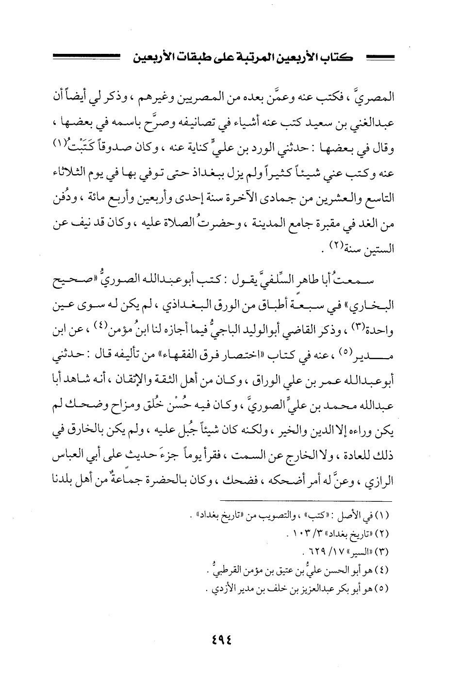 المصري، فكتب عنه وعمن بعده من المصريين وغيرهم، وذكر لي أيضاً أن عبد الغني بن سعيد كتب عنه أشياء في تصانيفه وصرح باسمه في بعضها، وقال في بعضها: حدثني الورد بن علي كناية عنه، وكان صدوقاً كتبت عنه وكتب عني شيئاً كثيراً ولم يزل ببغداذ حتى توفي بها في يوم الثلاثاء التاسع والعشرين من جمادى الآخرة سنة إحدى وأربعين وأربع مائة، ودفن من الغد في مقبرة جامع المدينة، وحضرت الصلاة عليه، وكان قد نيف عن الستين سنة.