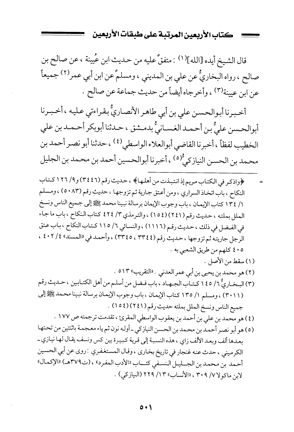 أخبرنا أبو الحسن علي بن أبي طاهر الأنصاري بقراءتي عليه، أخبرنا أبو الحسن علي بن أحمد الغساني بدمشق، حدثنا أبو بكر أحمد بن علي الخطيب لفظاً، أخبرنا القاضي أبو العلاء الواسطي، حدثنا أبو نصر أحمد بن محمد بن الحسن النيازكي، أخبرنا أبو الحسين أحمد بن محمد بن الجليل
