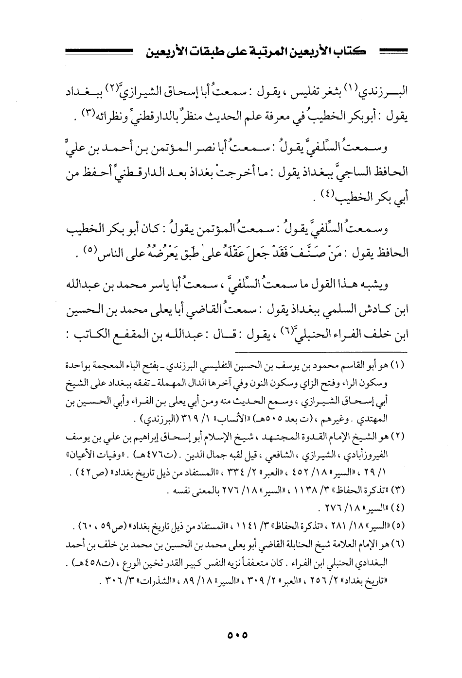 البرزندي بثغر تفليس، يقول: سمعت أبا إسحاق الشيرازي ببغداد يقول: أبو بكر الخطيب في معرفة علم الحديث منظرٌ بالدارقطني ونظرائه.