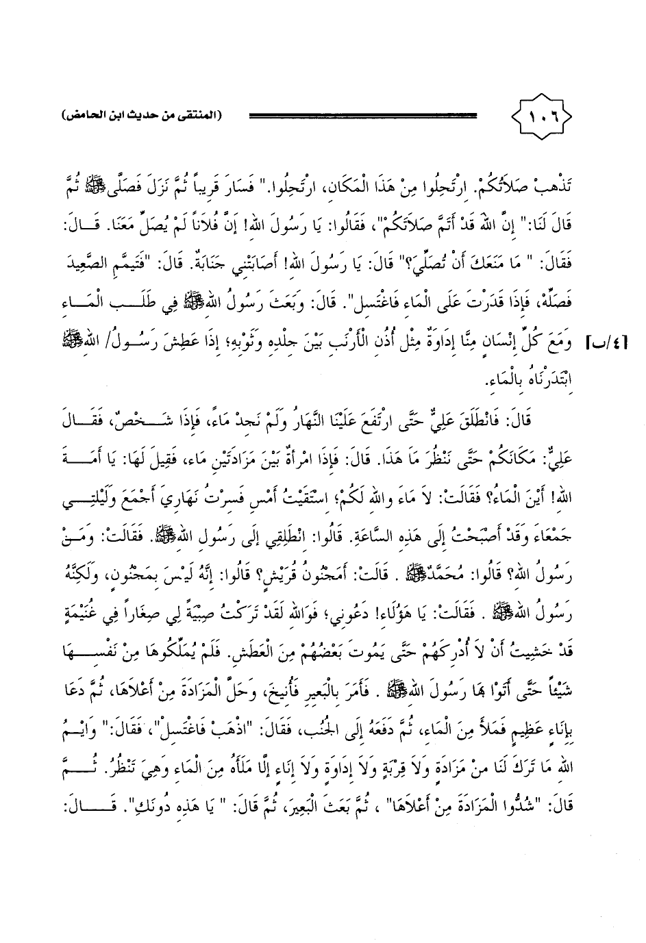قَالَ: فَانْطَلق عَليّ حَتَّى ارْتَفع علينا النَّهَار وَلم نجد مَاء، فَإِذا شخص، فَقَالَ عَليّ: مَكَانكُمْ حَتَّى نَنْظُر مَا هَذَا. قَالَ: فَإِذا امْرَأَة بَين مزداتين مَاء، فَقيل لَهَا: يَا أمة الله {أَيْن المَاء؟ فَقَالَت: لَا مَاء وَالله لكم؛ استقيت أمس فسرت نهاري أجمع وليلتي جَمْعَاء وَقد أَصبَحت إِلَى هَذِه السَّاعَة. قَالُوا: انطلقي إِلَى رَسُول الله - صَلَّى اللَّهُ عَلَيْهِ وَسَلَّم َ -. فَقَالَت: وَمن رَسُول الله؟ قَالُوا: مُحَمَّد - صَلَّى اللَّهُ عَلَيْهِ وَسَلَّم َ -. قَالَت: أمجنون قُرَيْش؟ قَالُوا: إِنَّه لَيْسَ بمجنون، وَلكنه رَسُول الله - صَلَّى اللَّهُ عَلَيْهِ وَسَلَّم َ -. فَقَالَت: يَا هَؤُلَاءِ} دَعونِي؛ فوَاللَّه لقد تركت صبية لي صغَارًا فِي غنيمَة قد خشيت أَن لَا أدركهم حَتَّى يَمُوت بَعضهم من الْعَطش. فَلم يملكوها من نَفسهَا شَيْئا حَتَّى أَتَوا بهَا رَسُول الله - صَلَّى اللَّهُ عَلَيْهِ وَسَلَّم َ -. فَأمر بالبعير فأنيخ، وَحل المزادة من أَعْلَاهَا، ثمَّ دَعَا بِإِنَاء عَظِيم فَمَلَأ من المَاء، ثمَّ دَفعه إِلَى الْجنب، فَقَالَ: " اذْهَبْ فاغتسل "، فَقَالَ: " وأيم الله مَا ترك لنا من مزادة وَلَا قربَة وَلَا إداوة وَلَا إِنَاء إِلَّا ملأَهُ من المَاء وَهِي تنظر. ثمَّ قَالَ: " شدوا المزادة من أَعْلَاهَا "، ثمَّ بعث الْبَعِير، ثمَّ قَالَ: " يَا هَذِه دُونك ". قَالَ: