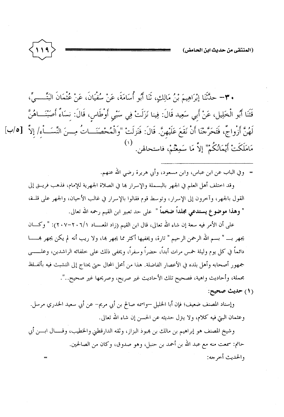 30 - حَدثنَا إِبْرَاهِيم بن مَالك، ثَنَا أَبُو أُسَامَة، عَن سُفْيَان، عَن عُثْمَان البتي، قثنا أَبُو الْخَلِيل، عَن أبي سعيد قَالَ: فِينَا نزلت فِي سبي أَوْطَاس، قَالَ: نسَاء أصبناهن لَهُنَّ أَزوَاج، فتحرجنا أَن نقع عَلَيْهِنَّ. قَالَ: فَنزلت " {وَالْمُحصنَات من النِّسَاء إِلَّا مَا ملكت أَيْمَانكُم} إِلَّا مَا سَمِعْتُمْ فاستحالهن.