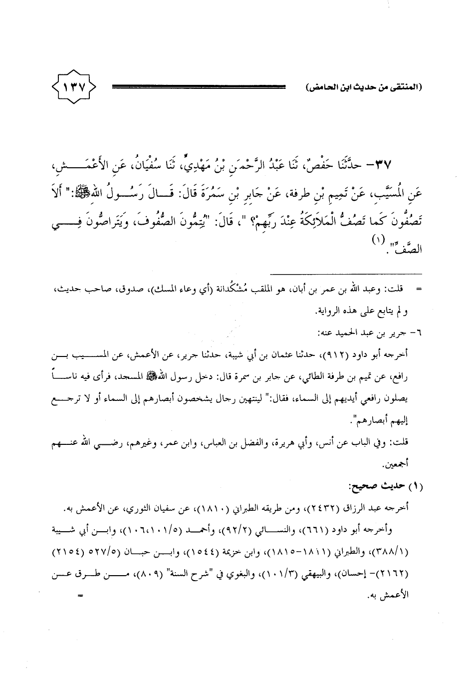 37 - حَدثنَا حَفْص، ثَنَا عبد الرَّحْمَن بن مهْدي، ثَنَا سُفْيَان، عَن الْأَعْمَش، عَن الْمسيب، عَن تَمِيم بن طرفَة، عَن جَابر بن سَمُرَة قَالَ: قَالَ رَسُول الله - صَلَّى اللَّهُ عَلَيْهِ وَسَلَّم َ -: " أَلا تصفون كَمَا تصف الْمَلَائِكَة عِنْد رَبهم؟ "، قَالَ: " يتمون الصُّفُوف، ويتراصون فِي الصَّفّ ".