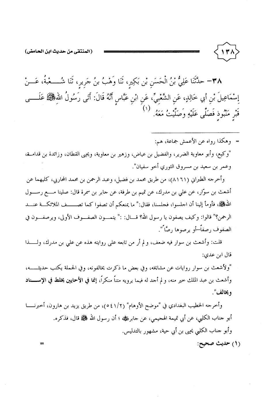 38 - حَدثنَا عَليّ بن الْحسن بن بكير، ثَنَا وهب بن جرير، ثَنَا شُعْبَة، عَن إِسْمَاعِيل بن أبي خَالِد، عَن الشّعبِيّ، عَن ابْن عَبَّاس أَنه قَالَ: أَتَى رَسُول الله - صَلَّى اللَّهُ عَلَيْهِ وَسَلَّم َ - على قبر منبوذ فصلى عَلَيْهِ وَصليت مَعَه.