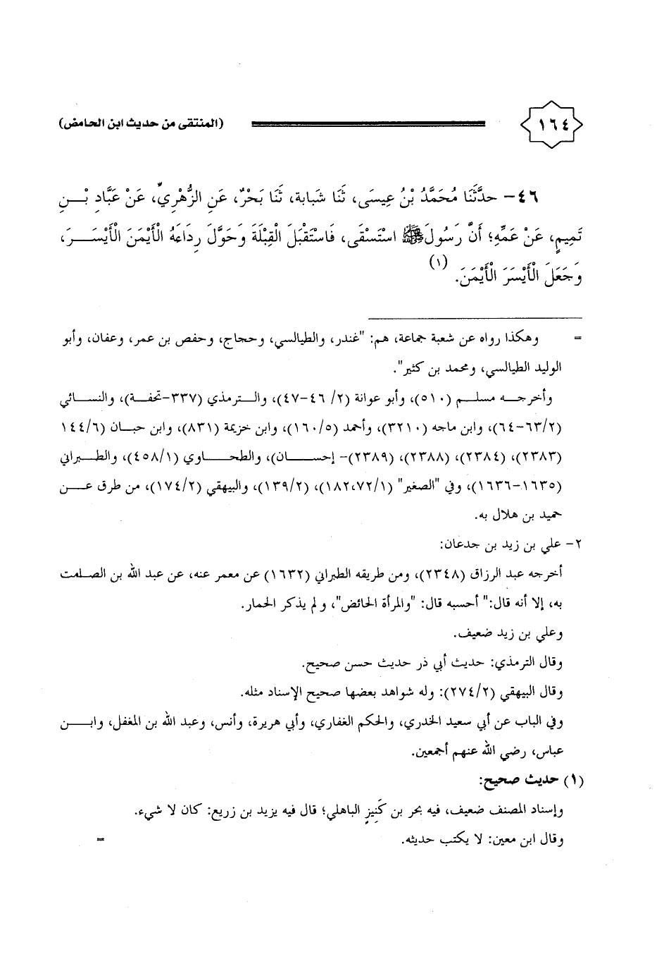 46 - حَدثنَا مُحَمَّد بن عِيسَى، ثَنَا شَبابَة، ثَنَا بَحر، عَن الزُّهْرِيّ، عَن عباد بن تَمِيم، عَن عَمه؛ أَن رَسُول الله - صَلَّى اللَّهُ عَلَيْهِ وَسَلَّم َ - استسقى، فَاسْتقْبل الْقبْلَة وحول رِدَاءَهُ الْأَيْمن الْأَيْسَر، وَجعل الْأَيْسَر الْأَيْمن.