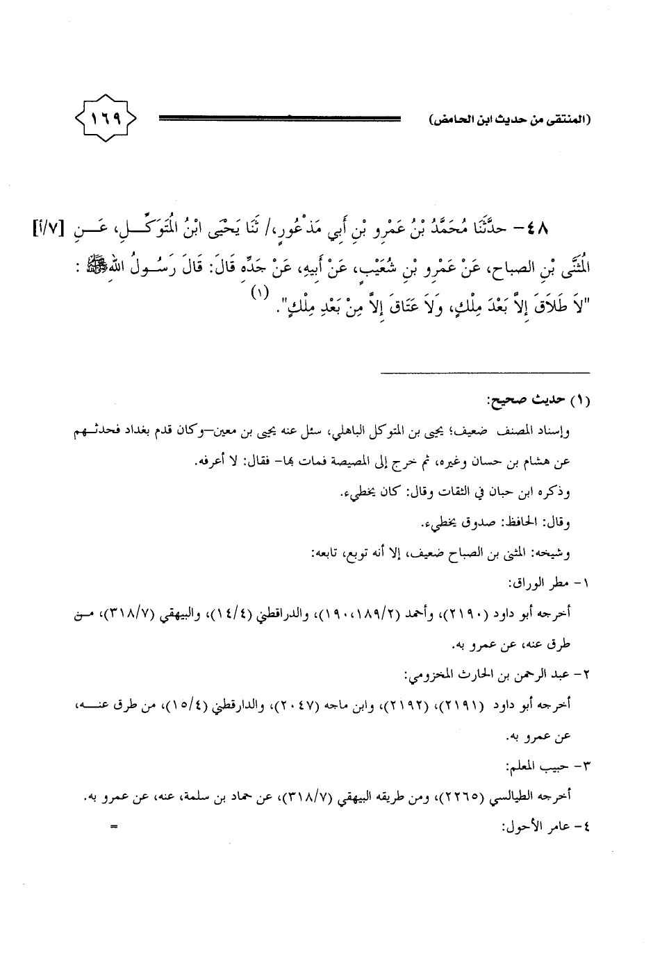 48 - حَدثنَا مُحَمَّد بن عَمْرو بن أبي مذعور، ثَنَا يحيى ابْن المتَوَكل، عَن الْمثنى بن الصَّباح، عَن عَمْرو بن شُعَيْب، عَن أَبِيه، عَن جده قَالَ: قَالَ رَسُول الله - صَلَّى اللَّهُ عَلَيْهِ وَسَلَّم َ -: " لَا طَلَاق إِلَّا بعد ملك، وَلَا عتاق إِلَّا من بعد ملك ".
