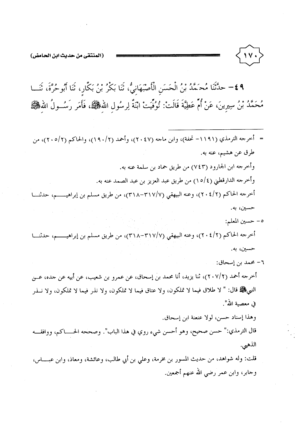 49 - حَدثنَا مُحَمَّد بن الْحسن الْأَصْبَهَانِيّ، ثَنَا بكر بن بكار، ثَنَا أَبُو حرَّة، ثَنَا مُحَمَّد بن سِيرِين، عَن أم عَطِيَّة قَالَت: توفيت ابْنة لرَسُول الله - صَلَّى اللَّهُ عَلَيْهِ وَسَلَّم َ -، فَأمر رَسُول الله - صَلَّى اللَّهُ عَلَيْهِ وَسَلَّم َ -