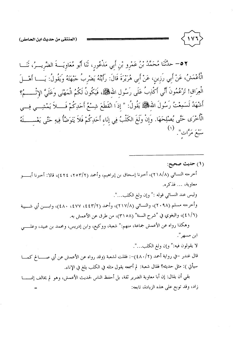 52 - حَدثنَا مُحَمَّد بن عَمْرو بن أبي مذعور، ثَنَا أَبُو مُعَاوِيَة الضَّرِير، ثَنَا الْأَعْمَش، عَن أبي رزين، عَن أبي هُرَيْرَة قَالَ: رَأَيْته يضْرب جَبهته وَيَقُول: يَا أهل الْعرَاق! تَزْعُمُونَ أَنِّي أكذب على رَسُول الله - صَلَّى اللَّهُ عَلَيْهِ وَسَلَّم َ -، فَيكون لكم المهنى وَعلي الْإِثْم؟ أشهد لسمعت رَسُول الله - صَلَّى اللَّهُ عَلَيْهِ وَسَلَّم َ - يَقُول: " إِذا انْقَطع شسع أحدكُم فَلَا يمشي فِي الْأُخْرَى حَتَّى يصلحها. وَإِن ولغَ الْكَلْب فِي إِنَاء أحدكُم فَلَا يتَوَضَّأ فِيهِ حَتَّى يغسلهُ سبع مَرَّات ".