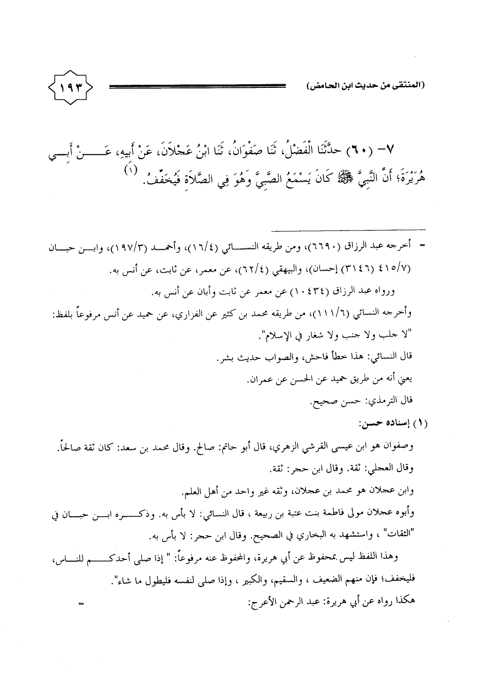 7 - (60) حَدثنَا الْفضل، ثَنَا صَفْوَان، ثَنَا ابْن عجلَان، عَن أَبِيه، عَن أبي هُرَيْرَة؛ أَن النَّبِي - صَلَّى اللَّهُ عَلَيْهِ وَسَلَّم َ - كَانَ يسمع الصَّبِي وَهُوَ فِي الصَّلَاة فيخفف.