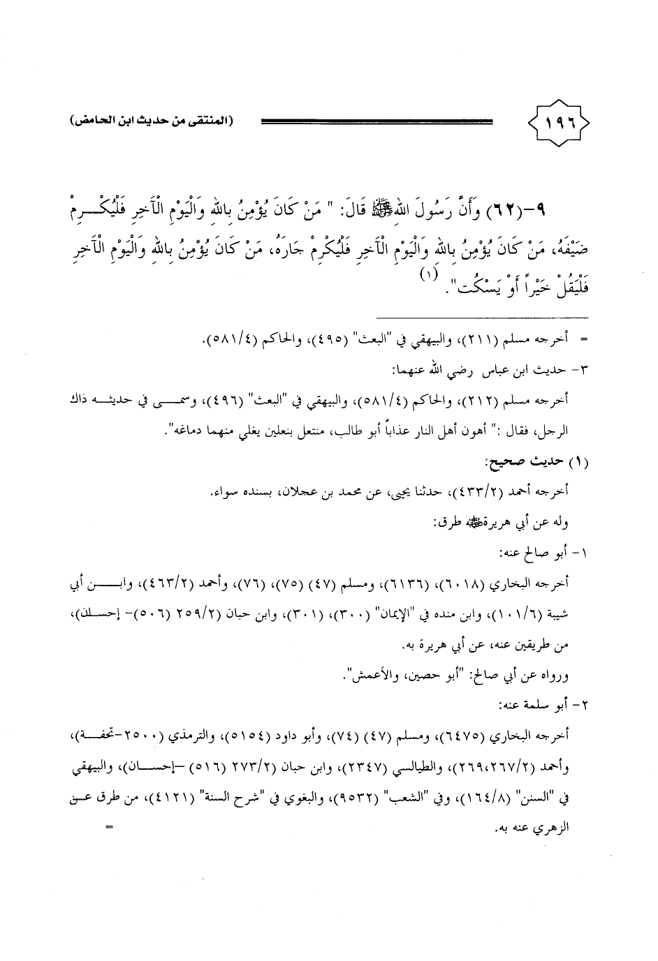 9 - (62) وَأَن رَسُول الله - صَلَّى اللَّهُ عَلَيْهِ وَسَلَّم َ - قَالَ: " من كَانَ يُؤمن بِاللَّه وَالْيَوْم الآخر فَليُكرم ضَيفه، من كَانَ يُؤمن بِاللَّه وَالْيَوْم الآخر فَليُكرم جَاره، من كَانَ يُؤمن بِاللَّه وَالْيَوْم الآخر فَلْيقل خيرا أَو يسكت ".