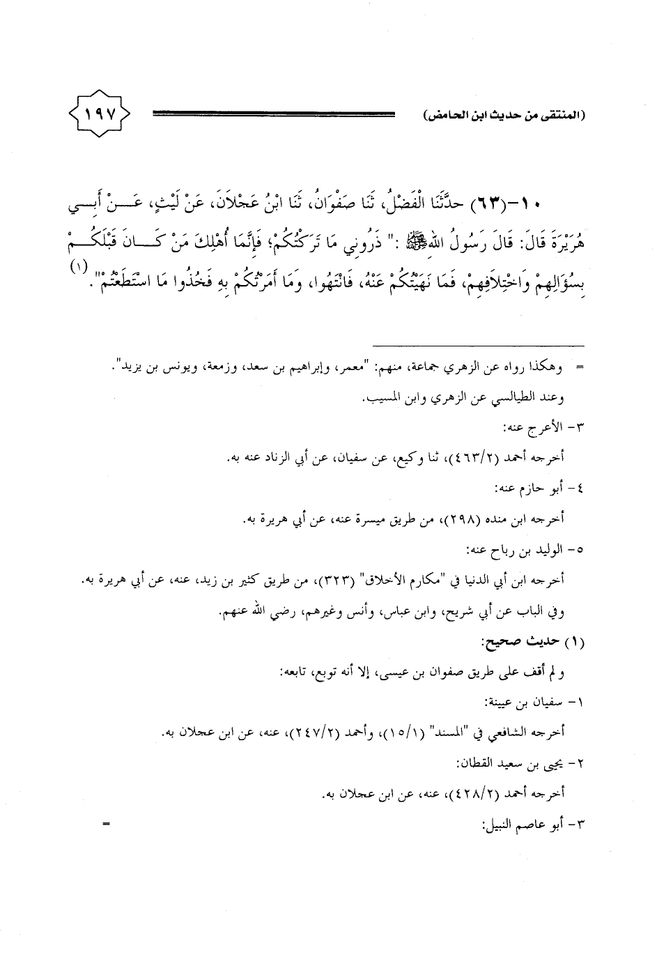 10 - (63) حَدثنَا الْفضل، ثَنَا صَفْوَان، ثَنَا ابْن عجلَان، عَن لَيْث، عَن أبي هُرَيْرَة قَالَ: قَالَ رَسُول الله - صَلَّى اللَّهُ عَلَيْهِ وَسَلَّم َ -: " ذروني مَا تركتكم؛ فَإِنَّمَا أهلك من كَانَ قبلكُمْ بسؤالهم وَاخْتِلَافهمْ، فَمَا نَهَيْتُكُمْ عَنهُ، فَانْتَهوا، وَمَا أَمرتكُم بِهِ فَخُذُوا مَا اسْتَطَعْتُم ".