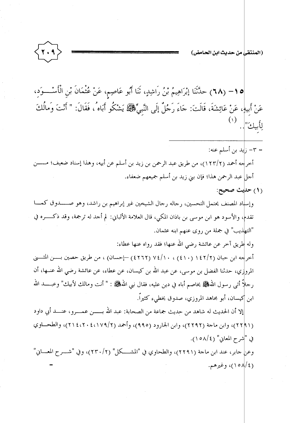 15 - (68) حَدثنَا إِبْرَاهِيم بن رَاشد، ثَنَا أَبُو عَاصِم، عَن عُثْمَان بن الْأسود، عَن أَبِيه، عَن عَائِشَة، قَالَت: جَاءَ رجل إِلَى النَّبِي - صَلَّى اللَّهُ عَلَيْهِ وَسَلَّم َ - يشكو أَبَاهُ، فَقَالَ: " أَنْت وَمَالك لأَبِيك ... ".