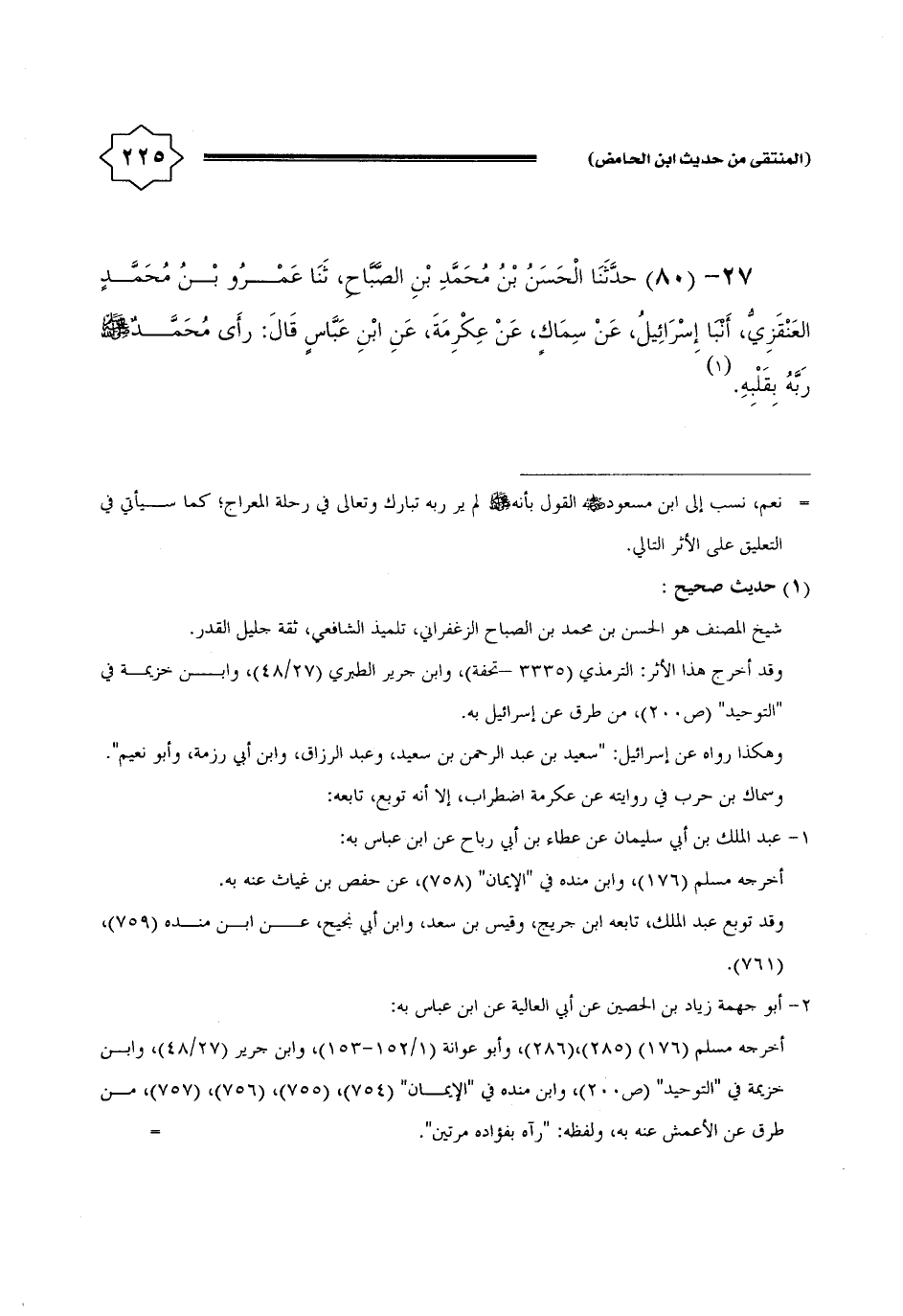 27 - (80) حَدثنَا الْحسن بن مُحَمَّد بن الصَّباح، ثَنَا عَمْرو بن مُحَمَّد الْعَنْقَزِي، أنبا إِسْرَائِيل، عَن سماك، عَن عِكْرِمَة، عَن ابْن عَبَّاس قَالَ: رأى مُحَمَّد - صَلَّى اللَّهُ عَلَيْهِ وَسَلَّم َ - ربه بِقَلْبِه.