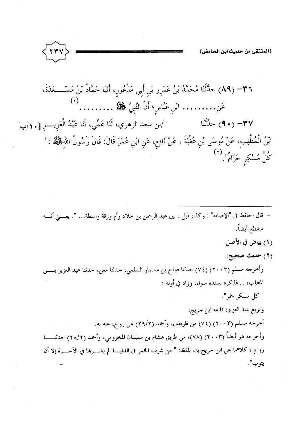 37 - (90) حَدثنَا / بن سعد الزُّهْرِيّ، ثَنَا عمي، ثَنَا عبد الْعَزِيز ابْن الْمطلب عَن مُوسَى بن عقبَة، عَن نَافِع، عَن ابْن عمر قَالَ: قَالَ رَسُول الله - صَلَّى اللَّهُ عَلَيْهِ وَسَلَّم َ -: " كل مُسكر حرَام ".