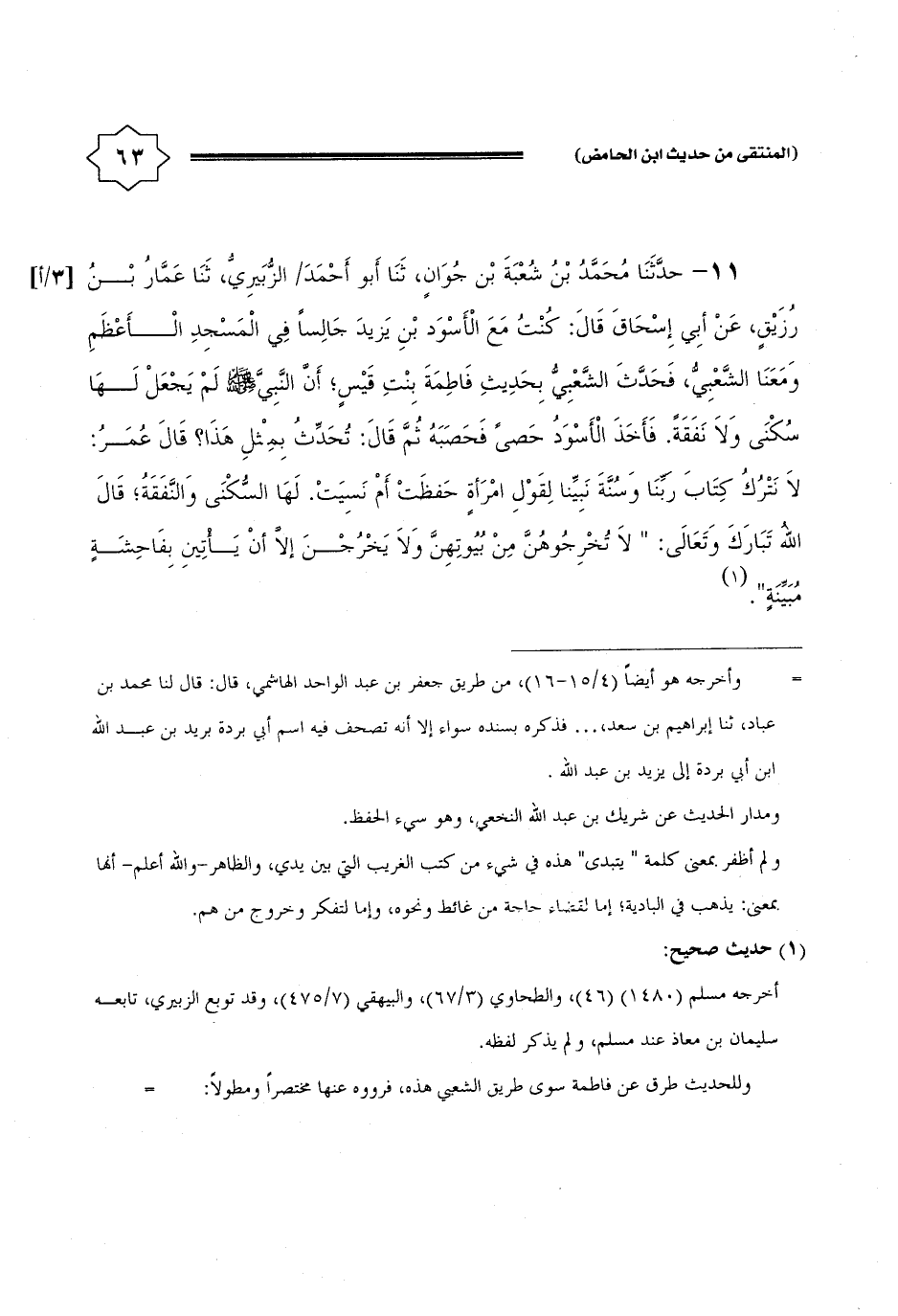 11 - حَدثنَا مُحَمَّد بن شُعْبَة بن جوان، ثَنَا أَبُو أَحْمد الزبيرِي، ثَنَا عمار بن رُزَيْق عَن أبي إِسْحَاق قَالَ: كنت مَعَ الْأسود بن يزِيد جَالِسا فِي الْمَسْجِد الْأَعْظَم ومعنا الشّعبِيّ، فَحدث الشّعبِيّ بِحَدِيث فَاطِمَة بنت قيس؛ أَن النَّبِي - صَلَّى اللَّهُ عَلَيْهِ وَسَلَّم َ - لم يَجْعَل لَهَا سُكْنى وَلَا نَفَقَة. فَأخذ الْأسود حَصى فَحَصَبه ثمَّ قَالَ: تحدث بِمثل هَذَا؟ قَالَ عمر: لَا نَتْرُك كتاب رَبنَا وَسنة نَبينَا لقَوْل امْرَأَة حفظت أم نسيت. لَهَا السُّكْنَى وَالنَّفقَة؛ قَالَ الله تبَارك وَتَعَالَى: {لَا تخرجوهن من بُيُوتهنَّ وَلَا يخْرجن إِلَّا أَن يَأْتِين بِفَاحِشَة مبينَة} .
