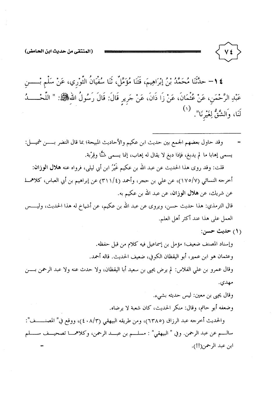 14 - حَدثنَا مُحَمَّد بن إِبْرَاهِيم، قثنا مُؤَمل، ثَنَا سُفْيَان الثَّوْريّ، عَن سلم بن عبد الرَّحْمَن، عَن عُثْمَان، عَن زَاذَان، عَن جرير قَالَ: قَالَ رَسُول الله - صَلَّى اللَّهُ عَلَيْهِ وَسَلَّم َ -: " اللَّحْد لنا، والشق لغيرنا.