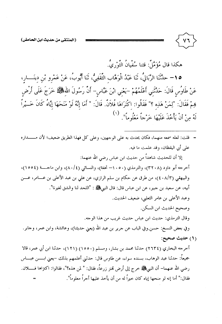 15 - حَدثنَا الريالي، ثَنَا عبد الْوَهَّاب الثَّقَفِيّ، ثَنَا أَيُّوب، عَن عَمْرو بن دِينَار، عَن طَاوس قَالَ: حَدثنِي أعلمهم - يَعْنِي ابْن عَبَّاس - أَن رَسُول الله - صَلَّى اللَّهُ عَلَيْهِ وَسَلَّم َ - خرج على أَرض بهم فَقَالَ: " لمن هَذِه؟ " فَقَالُوا: اكتراها فلَان. قَالَ: " أما إِنَّه لَو منحها إِيَّاه كَانَ خيرا لَهُ من أَن يَأْخُذ عَلَيْهَا خرجا مَعْلُوما ".