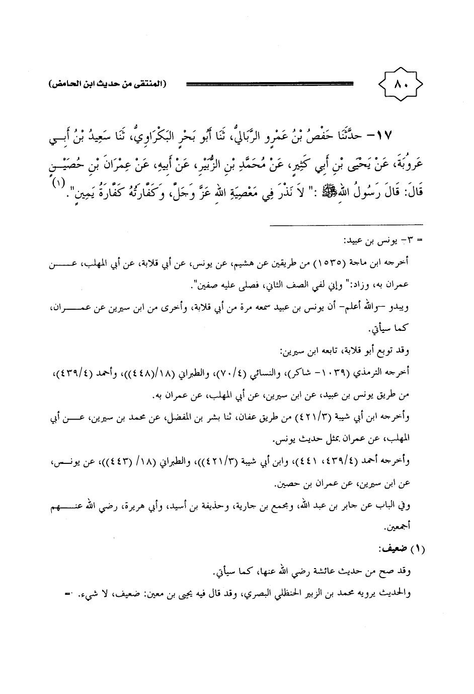 17 - حَدثنَا حَفْص بن عَمْرو الربالي، ثَنَا أَبُو بَحر البكراوي، ثَنَا سعيد بن أبي عرُوبَة، عَن يحيى بن أبي كثير، عَن مُحَمَّد بن الزبير، عَن أَبِيه، عَن عمرَان بن حُصَيْن قَالَ: قَالَ رَسُول الله - صَلَّى اللَّهُ عَلَيْهِ وَسَلَّم َ -: " لَا نذر فِي مَعْصِيّة الله عز وَجل، وكفارته كَفَّارَة يَمِين ".