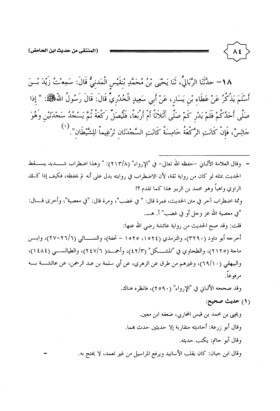 18 - حَدثنَا الربالي، ثَنَا يحيى بن مُحَمَّد بن قيس الْمدنِي قَالَ: سَمِعت زيد بن أسلم يذكر عَن عَطاء بن يسَار، عَن أبي سعيد الْخُدْرِيّ قَالَ: قَالَ رَسُول الله - صَلَّى اللَّهُ عَلَيْهِ وَسَلَّم َ -: " إِذا صلى أحدكُم فَلم يدر كم صلى أَثلَاثًا أم أَرْبعا، فَليصل رَكْعَة ثمَّ يسْجد سَجْدَتَيْنِ وَهُوَ جَالس، فَإِن كَانَت الرَّكْعَة خَامِسَة كَانَت السجدتان ترغيماً للشَّيْطَان ".