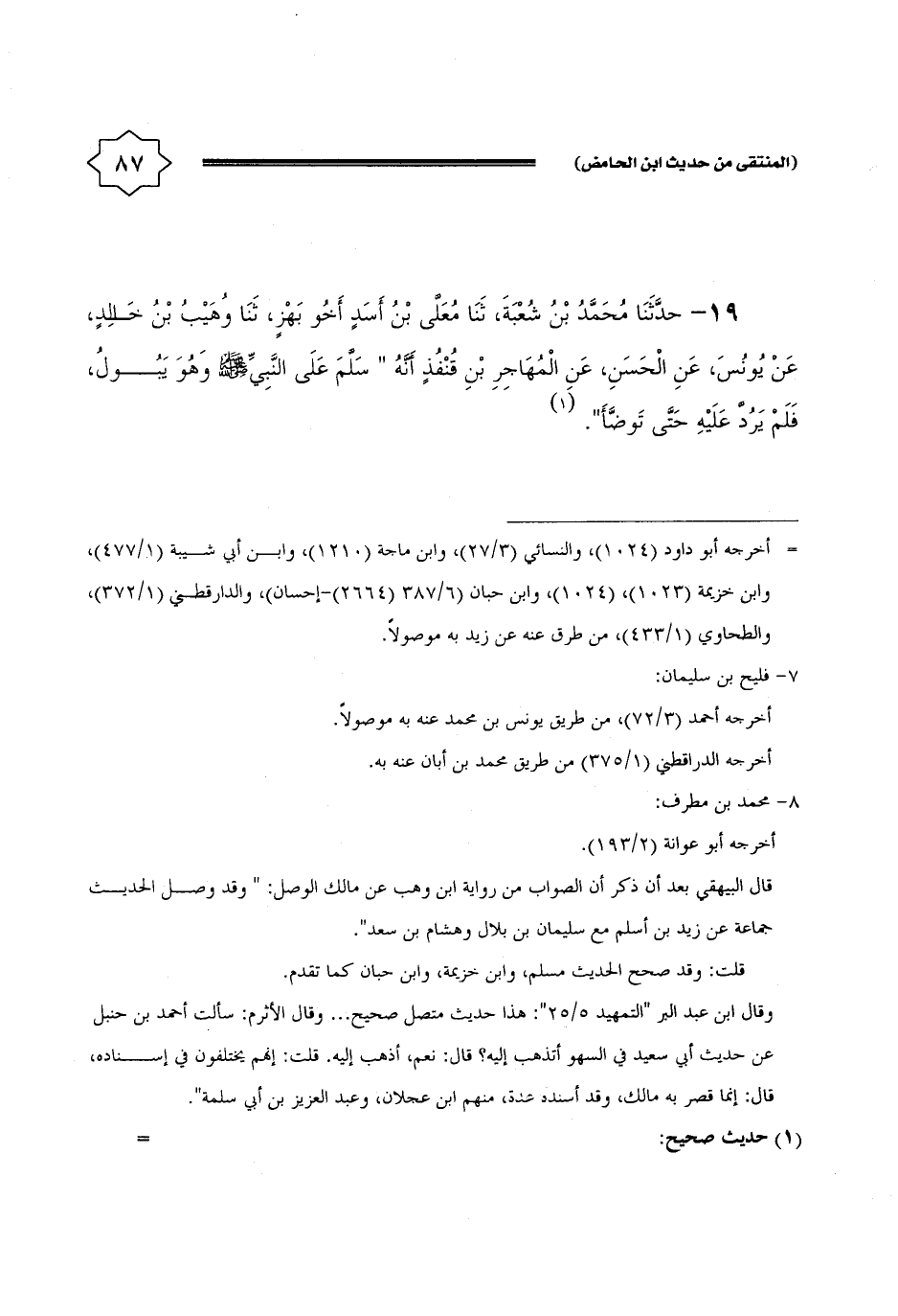 19 - حَدثنَا مُحَمَّد بن شُعْبَة، ثَنَا مُعلى بن أَسد أَخُو بهز، ثَنَا وهيب بن خَالِد، عَن يُونُس، عَن الْحسن، عَن المُهَاجر بن قنفذ أَنه سلم على النَّبِي