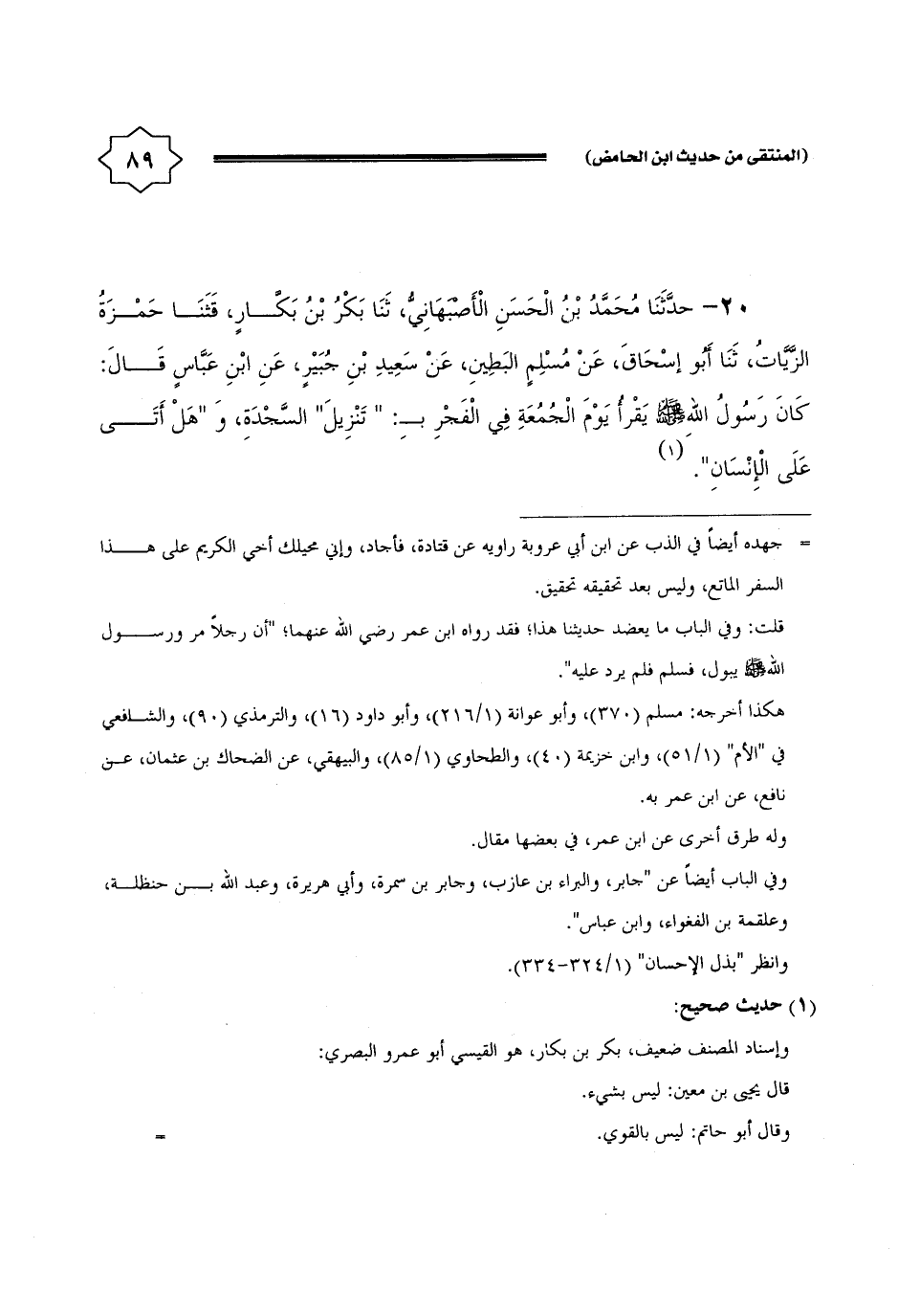 20 - حَدثنَا مُحَمَّد بن الْحسن الْأَصْبَهَانِيّ، ثَنَا بكر بن بكار، قثنا حَمْزَة الزيات، ثَنَا أَبُو إِسْحَاق، عَن مُسلم البطين، عَن سعيد بن جُبَير، عَن ابْن عَبَّاس قَالَ: كَانَ رَسُول الله