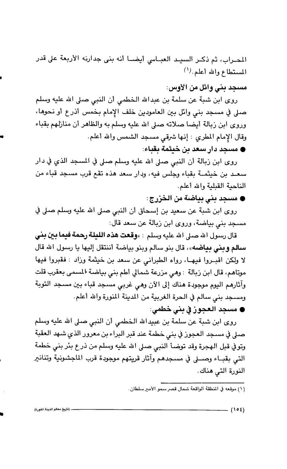 * مسجد بني وائل من الأوس: روى ابن شبة عن سلمة بن عبد الله الخطمي أن النبي صلى الله عليه وسلم صلى في مسجد بني وائل بين العامودين خلف الإمام بخمس أذرع أو نحوها، وروى ابن زبالة أيضاً صلاته صلى الله عليه وسلم به والظاهر أن منازلهم بقباء وقال الإمام المطري: إنها شرقي مسجد الشمس والله أعلم.