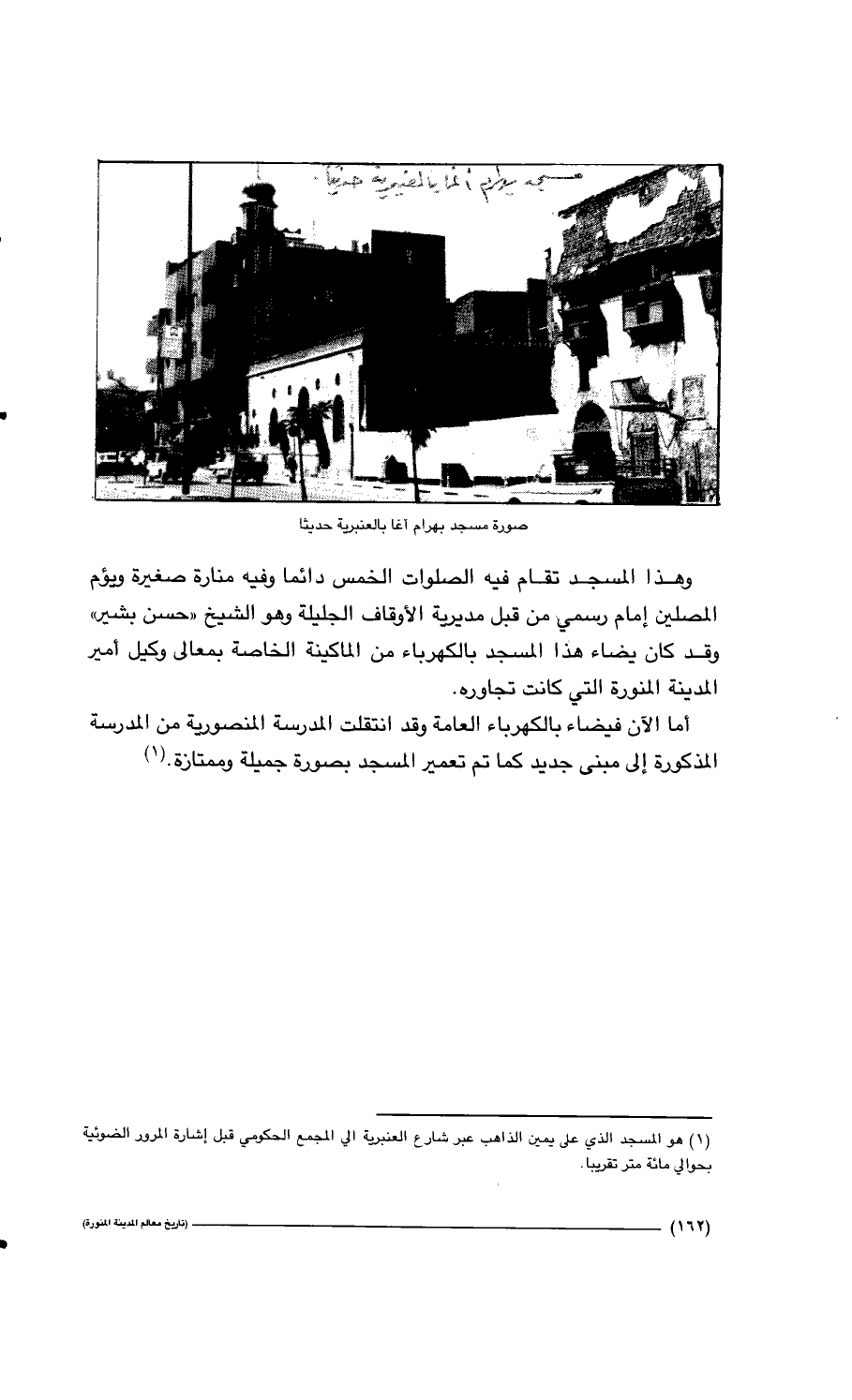 162…صورة مسجد بهرام آغا بالعنبرية حديثاً وهذا المسجد تقام فيه الصلوات الخمس دائماً وفيه منارة صغيرة ويؤم المصلين إمام رسمي من قبل مديرية الأوقاف الجليلة وهو الشيخ " حسن بشير" وقد كان يضاء هذا المسجد بالكهرباء من الماكينة الخاصة بمعالي وكيل أمير المدينة المنورة التي كانت تجاوره. أما الآن فيضاء بالكهرباء العامة وقد انتقلت المدرسة المنصورية من المدرسة المذكورة إلى مبنى جديد كما تم تعمير المسجد بصورة جميلة وممتازة (1).…