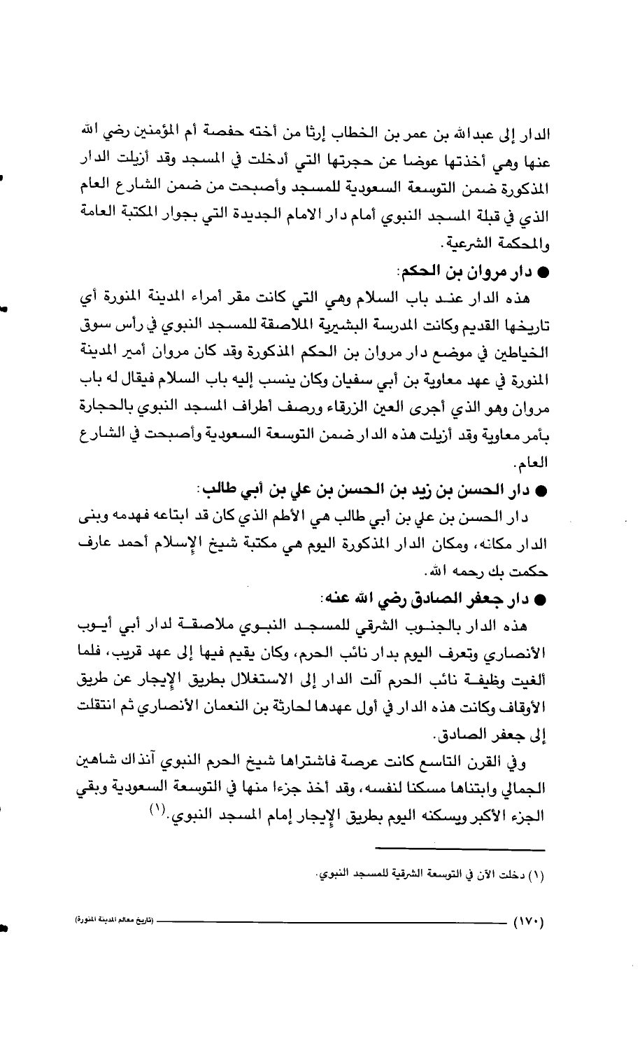 170…الدار إلى عبد الله بن عمر بن الخطاب إرثاً من أخته حفصة أم المؤمنين رضي الله عنها وهي أخذتها عوضاً عن حجرتها التي أدخلت في المسجد وقد أزيلت الدار المذكورة ضمن التوسعة السعودية للمسجد وأصبحت من ضمن الشارع العام الذي في قبلة المسجد النبوي أمام دار الامام الجديدة التي بجوار المكتبة العامة والمحكمة الشرعية.