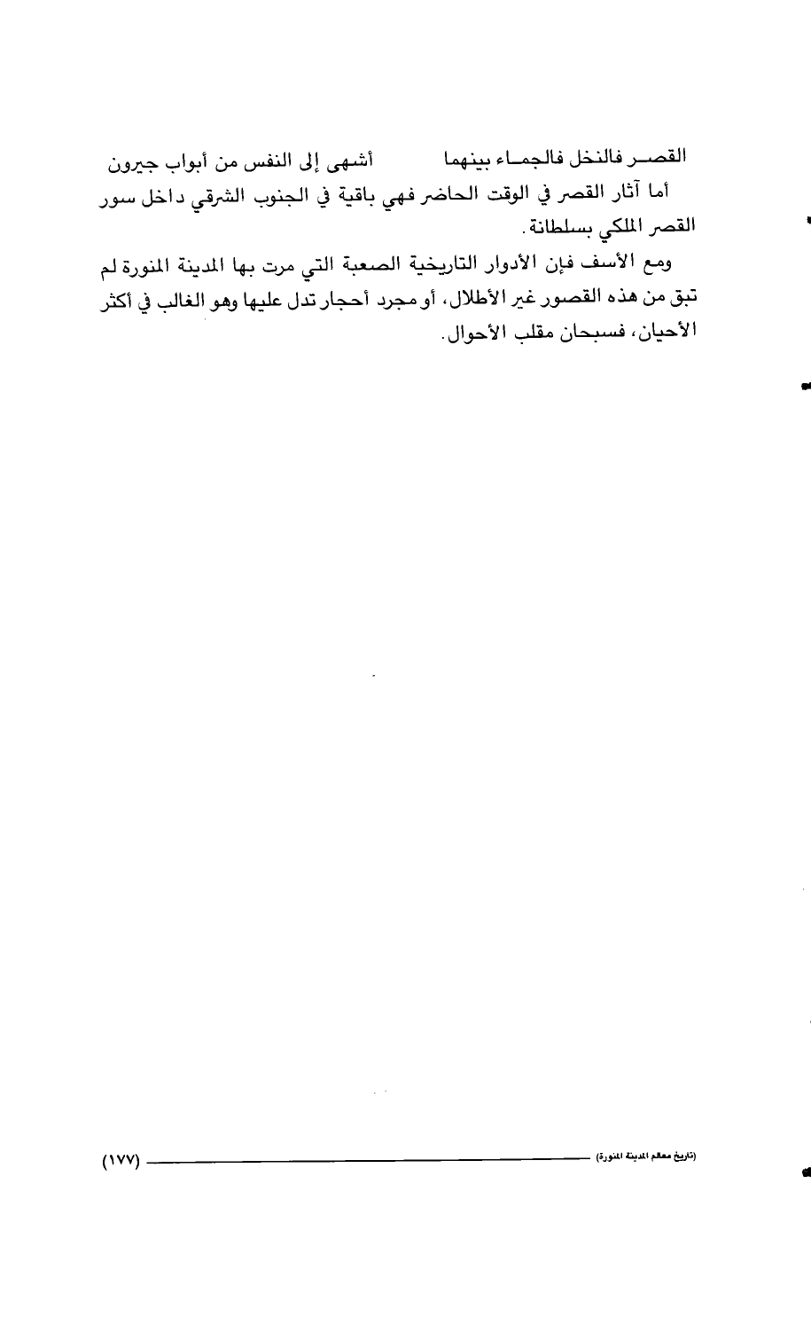 ومع الأسف فإن الأدوار التاريخية الصعبة التي مرت بها المدينة المنورة لم تبق من هذه القصور غير الأطلال، أو مجرد أحجار تدل عليها وهو الغالب في أكثر الأحيان فسبحان مقلب الأحوال.…