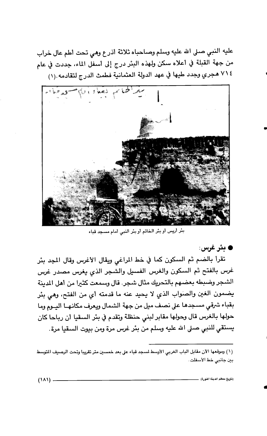 181…عليه النبي صلى الله عليه وسلم وصاحباه ثلاثة أذرع وهي تحت أطم عال خراب من جهة القبلة في أعلاه سكن ولهذه البئر درج إلى أسفل الماء، جددت في عام 714 هجري وجدد طيها في عهد الدولة العثمانية فطمث الدرج لتقادمه. (1) بئر أريس أو بئر الخاتم أو بئر النبي أمام مسجد قباء