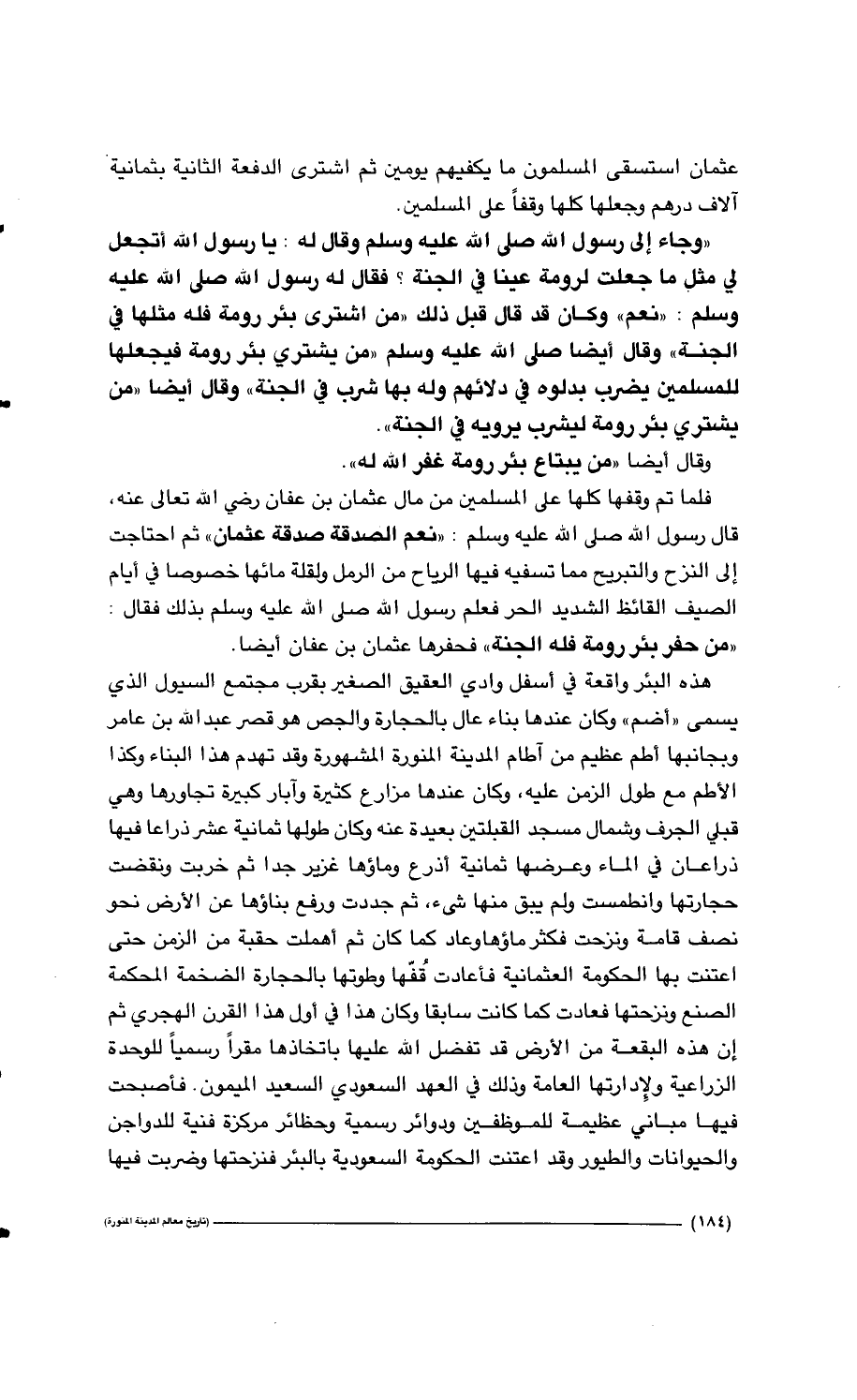 184…عثمان استسقى المسلمون ما يكفيهم يومين ثم اشترى الدفعة الثانية بثمانية آلاف درهم وجعلها كلها وقفاً على المسلمبن. " وجاء إلى رسول الله صلى الله عليه وسلم فقال له: يا رسول الله صلى الله عليه وسلم:" نعم" وكان قد قال قبل ذلك " من اشترى بئر رومة فله مثلها في الجنة " وقال أيضاً صلى الله عليه وسلم " من يشتري بئر رومة فيجعلها للمسلمين يضرب بدلوه في دلائهم وله بها شرب في الجنة " وقال أيضاً " من يشتري بئر رومة ليشرب يرويه في الجنة ". وقال أيضاً " من يبتاع بئر برومة غفر الله له ". فلما تم وقفها كلها على المسلمين من مال عثمان بن عفان رضي الله تعالى عنه، قال رسول الله صلى الله عليه وسلم:" نعم الصدقة صدقة عثمان " ثم احتاجت إلى النزح والتبريح مما تسفيه فيها الرياح من الرمل ولقلة مائها خصوصاً في أيام الصيف القائظ الشديد الحر فعلم رسول الله صلى الله عليه وسلم بذلك فقال: " من حفر بئر رومة فله الجنة " فحفرها عثمان بن عفان أيضاً. هذه البئر واقعة في أسفل وادي العقيق الصغير بقرب مجتمع السيول الذي يسمى "أضم" وكان عندها بناء عال بالحجارة والجص هو قصر عبد الله بن عامر وبجانبها أطم عظيم من آطام المدينة المنورة المشهورة وقد تهدم هذا البناء وكذا الأطم على طول الزمن عليه، وكان عندها مزارع كثيرة وآبار كبيرة تجاورها وهي قبلي الجرف وشمال مسجد القبلتين بعيد عنه وكان طولها ثمانية عشر ذراعاً فيها ذراعان في الماء وعرضها ثمانية أذرع وماؤها غزير جداً ثم خرجت ونقضت حجارتها وانطمست ولم يبق منها شيء، ثم جددت ورفع بناؤها عن ا"لأرض نحو نصف قامة ونزحت فكثر ماؤها وعاد كما كان ثم أهملت حقبة من الزمن حتى اعتنت بها الحكومة العثمانية فأعادت قُفّها وطوتها بالحجارة الضخمة المحكمة الصنع ونزحتها فعادت كما كانت سابقاً وكان هذا في أول هذا القرن الهجري ثم إن هذه البقعة من الأرض قد تفضل الله عليها باتخاذها مقراً رسمياً للوحدة الزراعية ولإدارتها العامة وذلك في العهد السعودي السعيد الميمون. فأصبحت فيها مباني عظيمة للموظفين ودوائر رسمية وحظائر مركزية فنية للدواجن والحيوانات والطيور وقد اعتنت الحكومة السعودية بالبئر فنزحتها وضربت فيها…