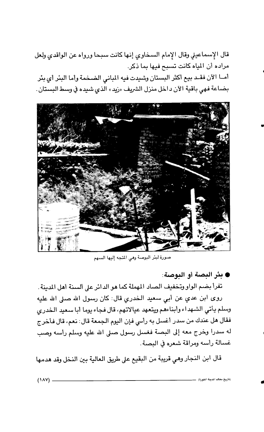 187…قال الإسماعيلي وقال الإمام السخاوي إنها كانت سبحاً ورواه عن الواقدي ولعل مراده أن المياه كانت تسبح فيها بما ذكر. أما الآن فقد بيع أكثر البستان وشيدت فيه المباني الضخمة وأما البئر أي بئر بضاعة فهي باقية الآن داخل منزل الشريف "زيد" الذي شيده في وسط البستان. صورة لبئر البوصة وهي المتجه إليها السهم
