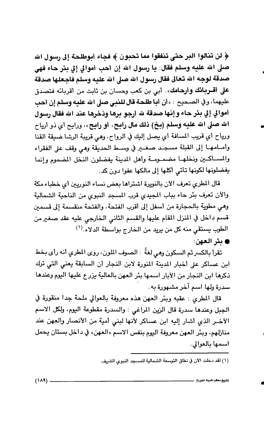 189… (لن تنالوا البر حتى تنفقوا مما تحبون) فجاء أبو طلحة إلى رسول الله صلى الله عليه وسلم فقال: يا رسول الله إن أحب أموالي إلي بئر حاء فهي صدقة لوجه الله تعالى فقال رسول الله صلى الله عليه وسلم فاجعلها صدقة على أقربائك وأرحامك ". أبي بن كعب وحسان بن ثابت من أقربائه فتصدق عليهما، وفي الصحيح:" أن أبا طلحة قال للنبي صلى الله عليه وسلم إن أحب أموالي إلي بئر حاء وإنها صدقة لله أرجو برها وذخرها عند الله فقال رسول الله صلى الله عليه وسلم (بخ) ذلك مال رابح، أو رايح "، ورايح أي ذو أرياح ورياح أي قريب المسافة أي يصل إليك في الرواح، وهي قريبة الرشا ضيقة القنا وأمامها إلى القبلة مسجد صغير في وسط الحديقة وهي وقف على الفقراء والمساكين ونخلها مضمونة وأهل المدينة يفضلون النخل المضموم وإنما يفضلونها لكونها تأتي أكلها إلى مالكها عفواً دون كد. قال المطري تعرف الأن بالنويرة اشتراها بعض نساء النوريين أي خطباء مكة والآن تعرف بئر حاء بباب المجيد قرب المسجد النبوي من الناحية الشمالية وهي مطوية بالحجارة من أسفل إلى أقرب الفتحة، والفتحة منقسمة إلى قسمين قسم داخل في المنزل المقام عليها والقسم الثاني الخارجي عليه عقد صغير من الطوب يستقي منه كل من يريد من الخارج بواسطة الدلاء. (1)