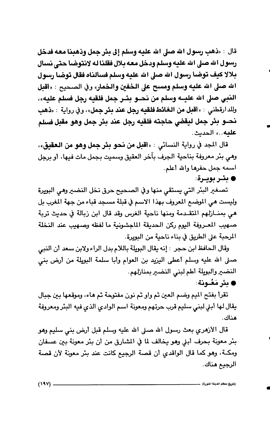 197…قال: " ذهب رسول الله صلى الله عليه وسلم إلى بئر جمل وذهبنا معه فدخل رسول الله صلى الله عليه وسلم ودخل معه بلال فقلنا له لانتوضأ حتى نسأل بلالا كيف توضأ رسول الله صلى الله عليه وسلم فسألناه فقال توضأ رسول الله صلى الله عليه وسلم ومسح على الخفين والخمار " وفي الصحيح:" أقبل النبي صلى الله عليه وسلم من نحو بئر جمل فلقيه رجل فسلم عليه ". وللدارقطني:" ليقضي حاجته فلقيه رجل عند بئر جمل وهو مقبل فسلم عليه .. " الحديث. قال المجد في رواية النسائي:" أقبل من نحو بئر جمل وهو من العقيق "، وهي بئر معروفة بناحية الجرف بآخر العقيق وسميت بجمل مات فيها، أو برجل اسمه جمل حفرها والله أعلم.