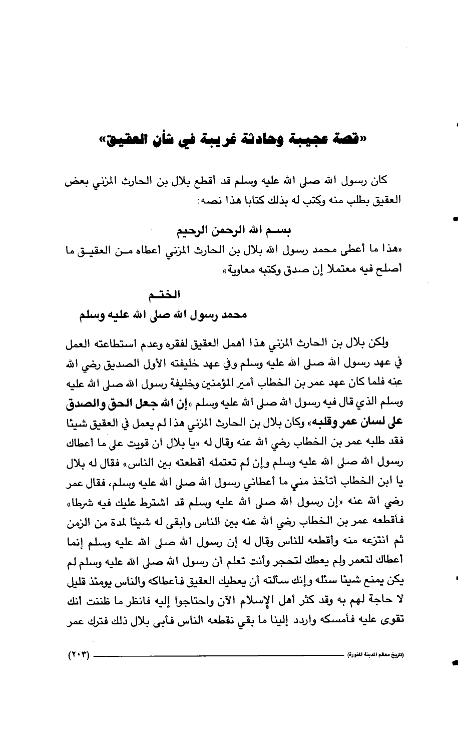 بسم الله الرحمن الرحيم " هذا ما أعطى محمد رسول الله بلال بن الحارث المزني أعطاه من العقيق ما أصلح فيه معتملاً إن صدق وكتبه معاوية "