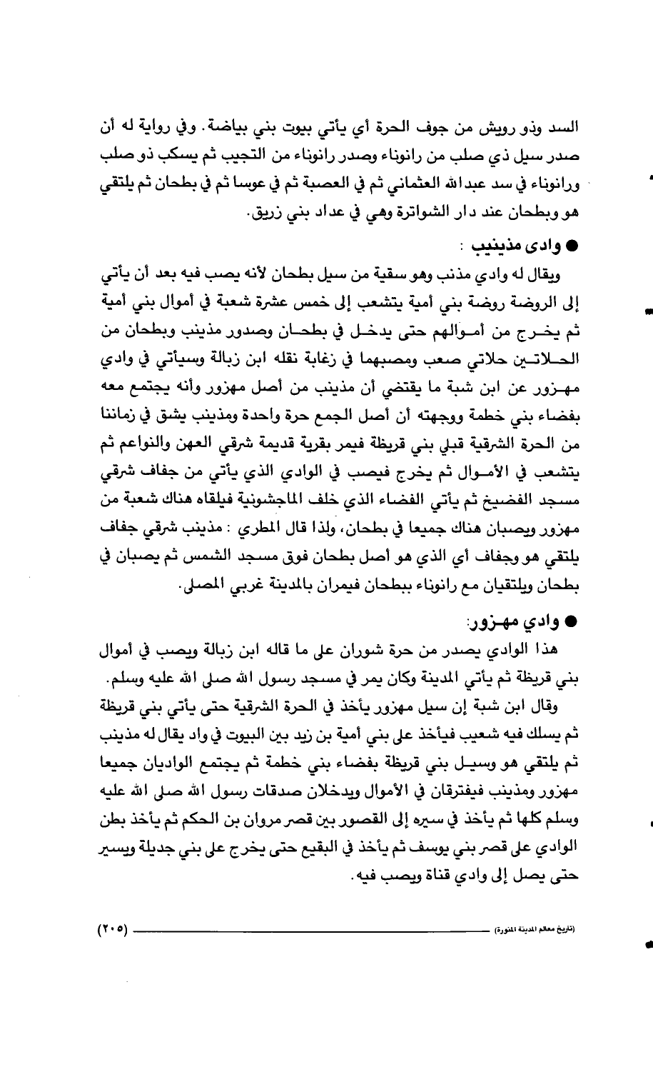 205…السد وذو رويش من جوف الحرة أي يأتي بيوت بني بياضة. وفي رواية له أن صدر سيل ذي صلب من رانوناء وصدر رانوناء من التجيب ثم يسكب ذو صلب ورانوناء في سد عبد الله العثماني ثم في العصبة ثم في عوسا ثم في بطحان ثم يلتقي هو وبطحان عند دار الشواترة وهي في عداد بني زريق.
