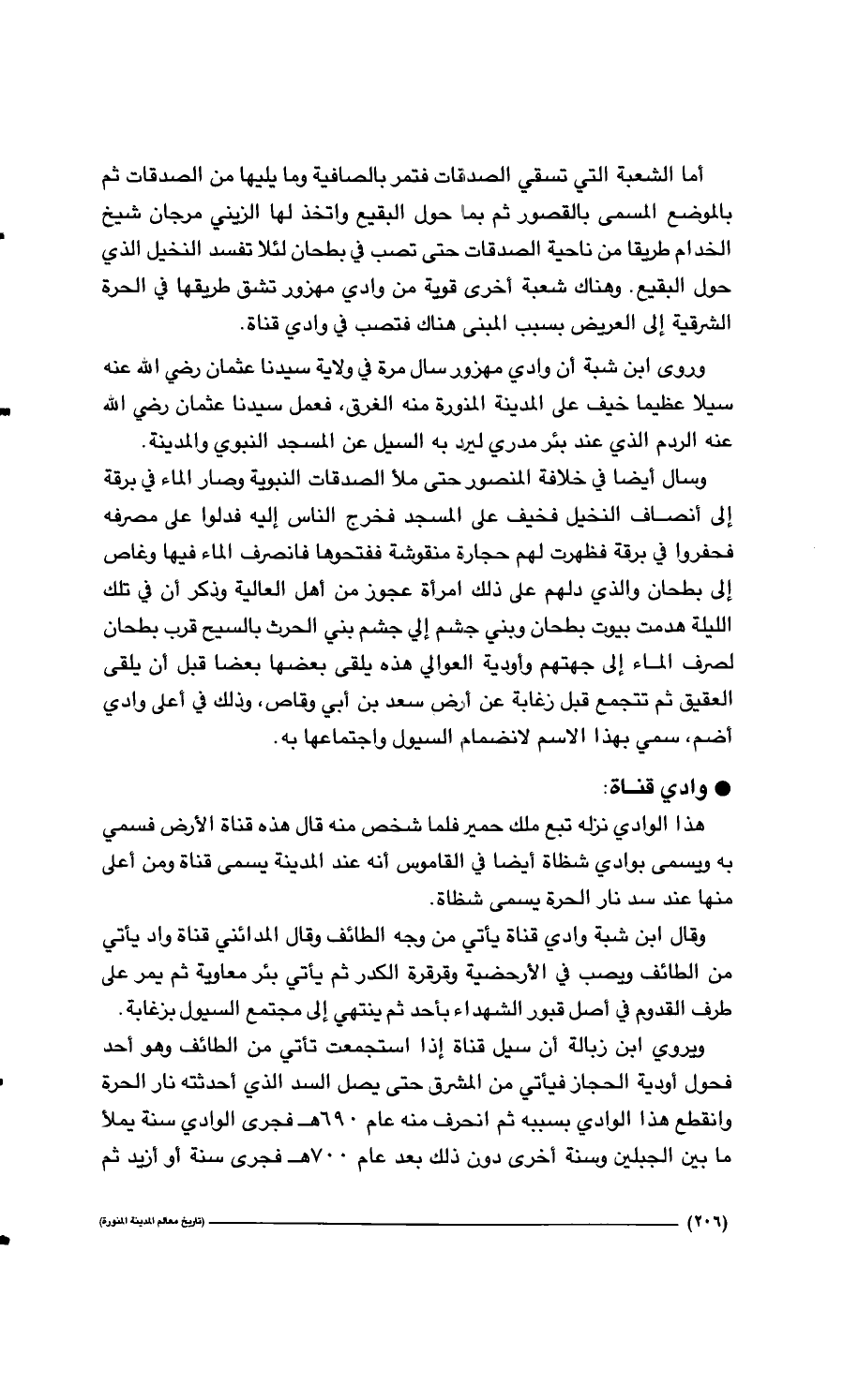 206…أما الشعبة التي تسقي الصدقات فتمر بالصافية وما يليها من الصدقات ثم بالموضع المسمى بالقصور ثم بما حول البقيع واتخذ لها الزيني مرجان شيخ الخدام طريقاً من ناحية الصدقات حتى تصب في بطحان لئلا تفسد النخيل الذي حول البقيع. وهناك شعبة أخرى قوية من وادي مهزوز تشق طريقها في الحرة الشرقية إلى العريض بسبب المبنى هناك فتصب في وادي قناة. وروى ابن شبة أن وادي مهزوز سال مرة في ولاية سيدنا عثمان رضي الله عنه سيلا عظيماً خيف على المدينة المنورة منه الغرق، فعمل سيدنا عثمان رضي الله عنه الردم الذي عند بئر مدري ليرد به السيل عن المسجد النبوي والمدينة. وسال أيضاً في خلافة المنصور حتى ملأ الصدقات النبوية وصار الماء في برقة إلى أنصاف النخيل فخيف على المسجد فخرج الناس إليه فدلوا على مصرفه فحفروا في برقة فظهرت لهم حجارة منقوشة ففتحوها فانصرف الماء فيها وغاص إلى بطحان والذي دلهم على ذلك امرأة عجوز من أهل العالية وذكر أن في تلك الليلة هدمت بيوت بطحان وبني جشم إلى جشم بني الحرث بالسيح قرب بطحان لصرف الماء إلى جهتهم وأودية العوالي هذه يلقى بعضها بعضاً قبل أن يلقى العقيق ثم تتجمع قبل زغابة عن أرض سعد بن أبي وقاص، وذلك في أعلى وادي أضم، سمي بهذا الاسم لانضمام السيول واجتماعها به.