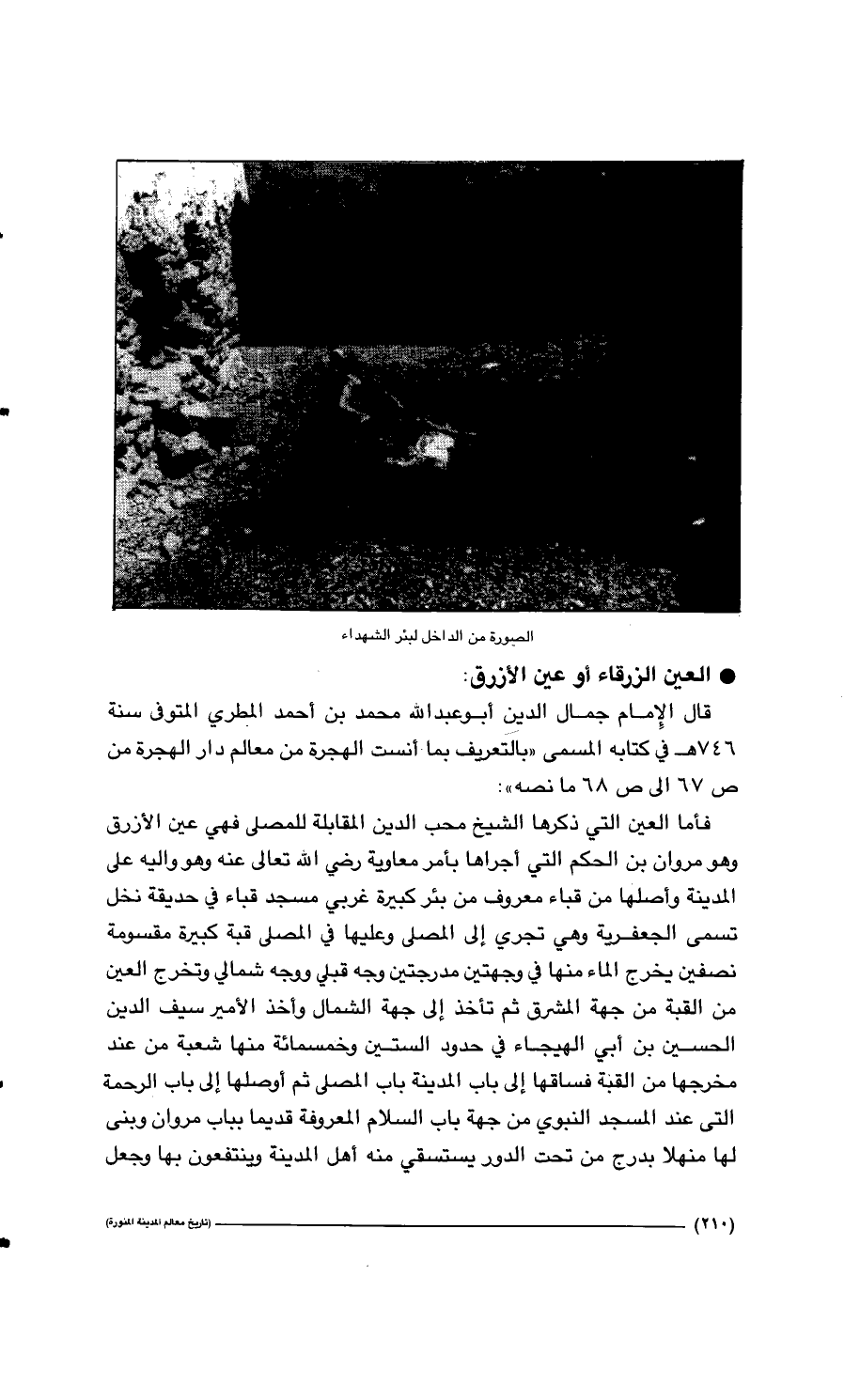 قال الأمام جمال الدين أبو عبد الله محمد بن أحمد المطري المتوفي سنة 746 هـ في كتابه المسمى " بالتعريف بما أنست الهجرة من معالم دار الهجرة من ص 67 إلى ص 68 ما نصه: فأما العين التي ذكرها الشيخ محب الدين المقابلة للمصلى فهي عين الزرق وهو مروان بن الحكم التي أجراها بأمر معاوية رضي الله تعالى عنه وهو واليه على المدينة وأصلها من قباء معروف من بئر كبيرة غربي مسجد قباء في حديقة نخل تسمى الجعفرية وهي تجرى إلى المصلى وعليها في المصلى قبة كبيرة مقسومة نصفين يخرج الماء منها في وجهتين مدرجتين وجه قبلي ووجه شمالي وتخرج العين من القبة من جهة المشرق ثم تأخذ إلى جهة الشمال وأخذ الأمير سيف الدين الحسين بن أبي الهيجاء في حدود الستين وخمسمائة منها شعبة من عند مخرجها من القبة فساقها إلى باب المدينة باب المصلى ثم أوصلها إلى باب الرحمة التي عند المسجد النبوي من جهة باب السلام المعروفة قديماً بباب مروان وبنى لها منهلاً بدرج من تحت الورد يستسقي منه أله المدينة وينتفعون بها وجعل…
