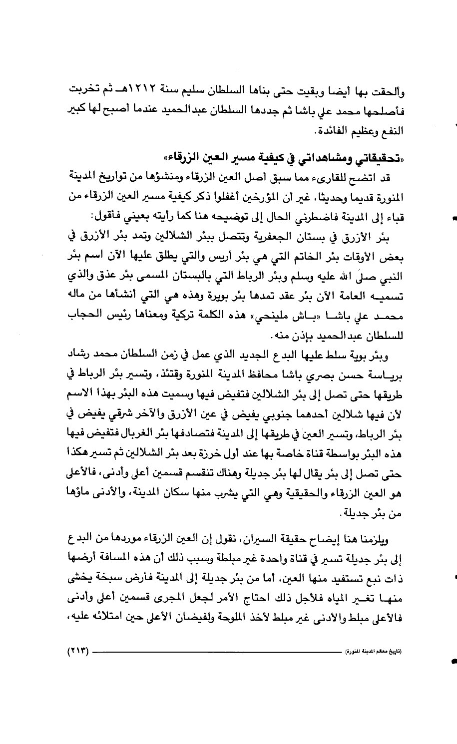 قد اتضح للقارئ مما سبق أصل العين الزرقاء ومنشؤها من تواريخ المدينة المنورة قديماً وحديثاً، غير أن المؤرخين أغفلوا ذكر كيفية مسير العين الزرقاء من قباء إلى المدينة فاضطرني الحال إلى توضيحه هنا كما رأيته بعيني فأقول: بئر الأزرق في بستان الجعفرية وتتصل ببئر الشلالين وتمد بئر الأزرق في بعض الأوقات بئر الخاتم هي بئر أريس والتي يطلق عليها الآن اسم بئر النبي صلى الله عليه وسلم وبئر الرباط التي بالبستان المسمى بئر عذق والذي تسميه العامة الآن بئر عقد تمدها بويرة وهذه هي التي أنشأها من ماله محمد علي باشا " باش ملينحي " هذه الكلمة تركية ومعناها رئيس الحجاب للسلطان عبد الحميد بإذن منه. وبئر بوية سلط عليها البدع الجديد الذي عمل في زمن السلطان محمد رشاد برياسة حسن بصري باشا محافظ المدينة المنورة وقتئذ، وتسير بئر الرباط طريقها حتى تصل إلى بئر الشلالين فتفيض فيها وسميت هذه البئر بهذا الاسم لأن فيها شلالين أحدهما جنوبي يفيض في عين الأزرق والآخر شرقي يفيض في بئر الرباط، وتسير العين في طريقها إلى المدينة فتصادفها بئر الغربال فتفيض فيها هذه البئر بواسطة قناة خاصة بها عند أول خرزة بعد بئر الشلالين ثم تسير هكذا حتى تصل إلى بئر يقال لها بئر جديلة وهناك تنقسم قسمين أعلى وأدنى، فالأعلى هو العين الزرقاء والحقيقية وهي التي يشرب منها سكان المدينة، والأدنى ماؤها من بئر جديلة. ويلزمنا هنا إيضاح حقيقة السيران، نقول إن العين الزرقاء موردها من البدع إلى بئر جديلة تسير في قناة واحدة غير مبلطة وسبب ذلك أن هذه المسافة أرضها ذات نبع تستفيد منها العين، أما من بئر جديلة إلى المدينة فأرض سبخة يخشى منها تغير المياه فلأجل ذلك احتاج الأمر لجعل المجرى قسمين أعلى وأدنى فالأعلى مبلط والأدنى غير مبلط لأخذ الملوحة ولفيضان الأعلى حين امتلائه عليه،…