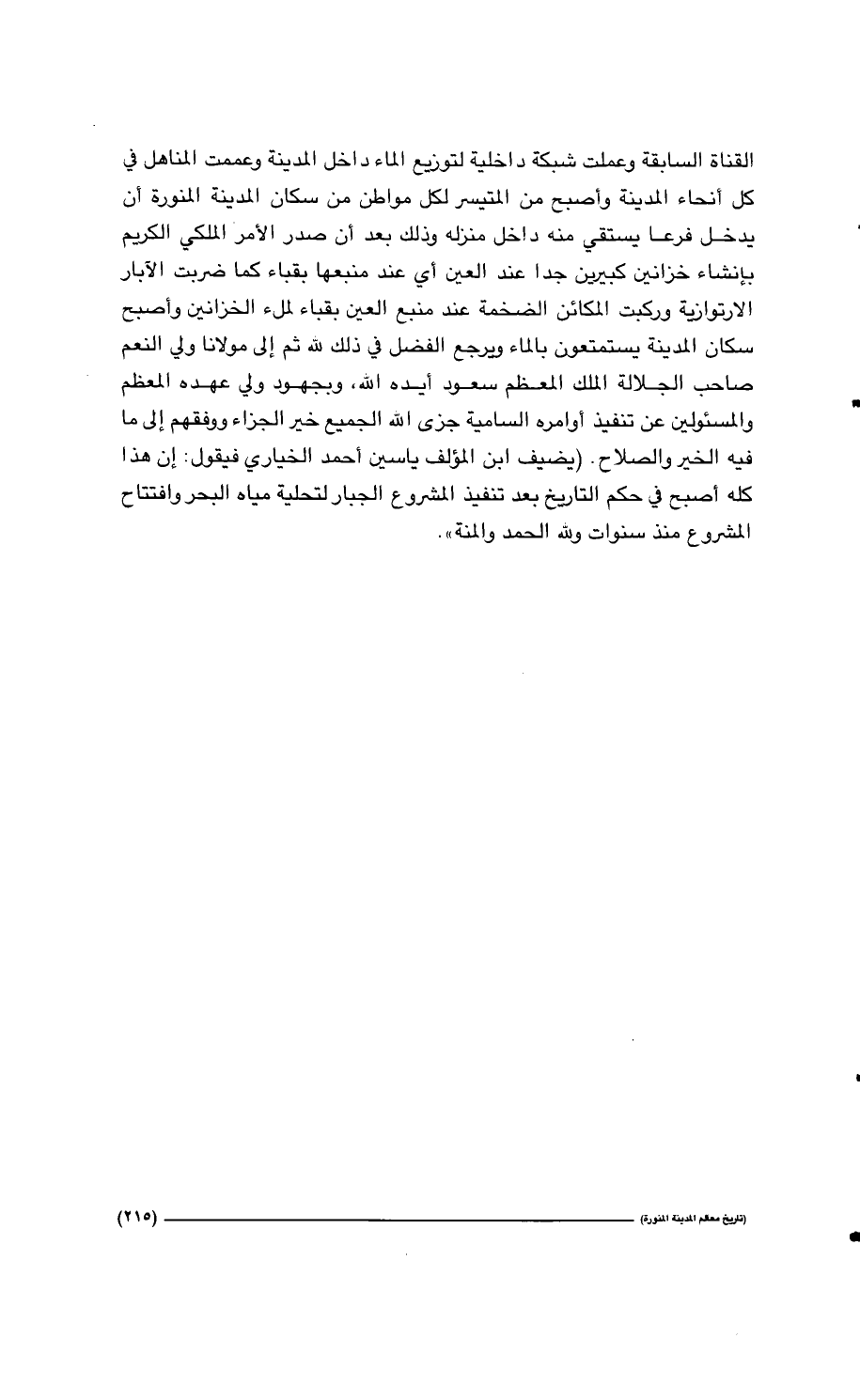 215…القناة السابقة وعملت شبكة داخلية لتوزيع الماء داخل المدينة وعممت المناهل في كل أنحاء المدينة وأصبح من المتيسر لكل مواطن من سكان المدينة المنورة أن يدخل فرعاً يستقي منه داخل منزله وذلك بعد أن صدر الأمر الملكي الكريم بإنشاء خزانين كبيرين جداً عند العين أي عند منبعها بقباء كما ضربت الآبار الارتوازية وركبت المكائن الضخمة عند منبع العين بقباء لملء الخزانين وأصبح سكان المدينة يستمتعون بالماء ويرجع الفضل في ذلك لله ثم إلى مولانا ولي النعم صاحب الجلالة الملك المعظم سعود أيده الله، وبجهود ولي عهده المعظم والمسئولين عن تنفيذ أوامره السامية جزى الله الجميع خير الجزاء ووفقهم إلى ما فيه الخير والصلاح. (يضيف ابن المؤلف ياسين أحمد الخياري فيقول: إن هذا كله أصبح في حكم التاريخ بعد تنفيذ المشروع الجبار لتحلية مياه البحر وافتتاح المشروع منذ سنوات ولله الحمد والمنة ".…