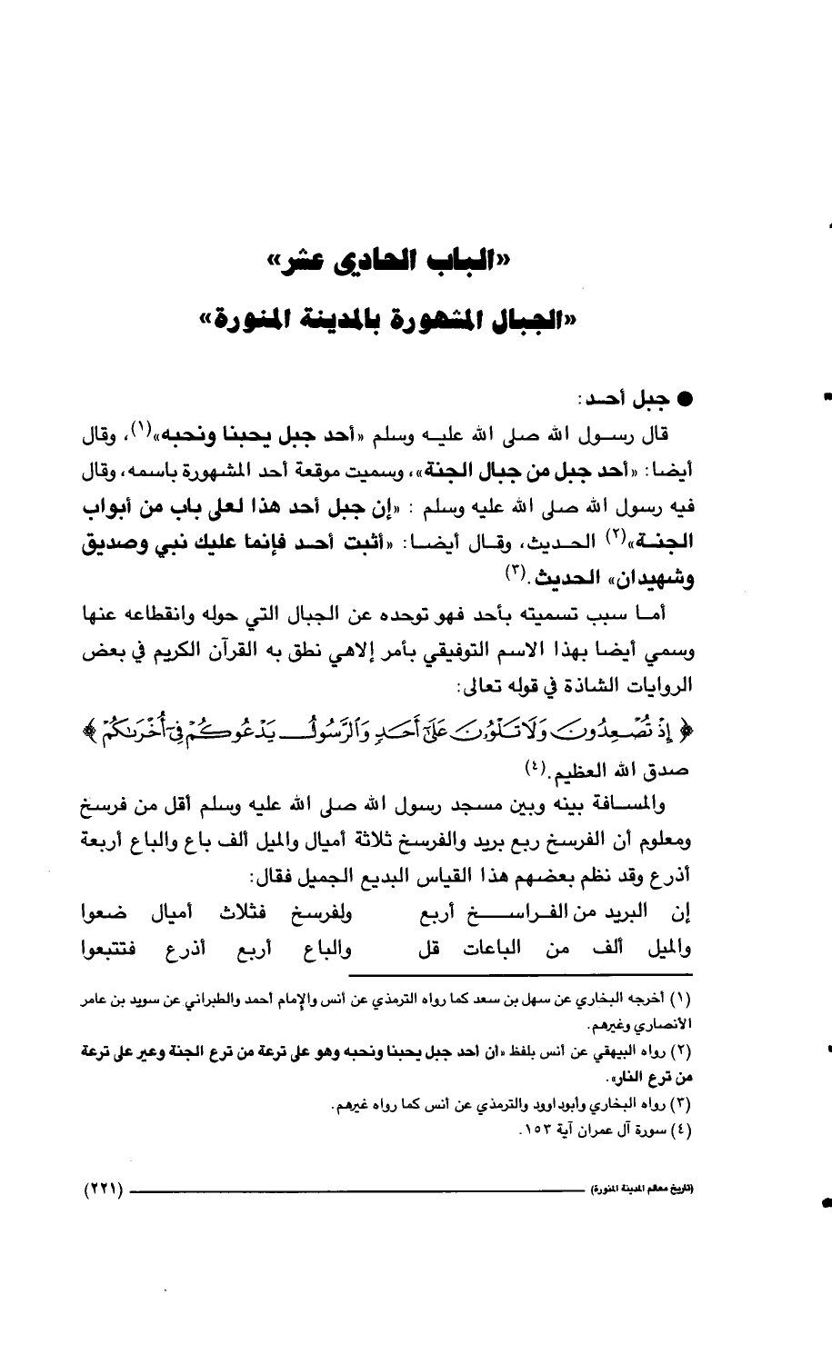 (1) أخرجه البخاري عن سهل بن سعد كما رواه الترمذي عن أنس والإمام أحمد والطبراني عن سويد بن عامر النصاري وغيرهم. (2) رواه البيهقي عن أنس بلفظ " أن أحد جبل يحبنا ونحبه وهو على ترعة من ترع الجنة وعير على ترعة من ترع النار. (3) رواه البخاري وأبو داوود والترمذي عن أنس كما رواه غيرهم. (4) سورة آل عمران آية 153.