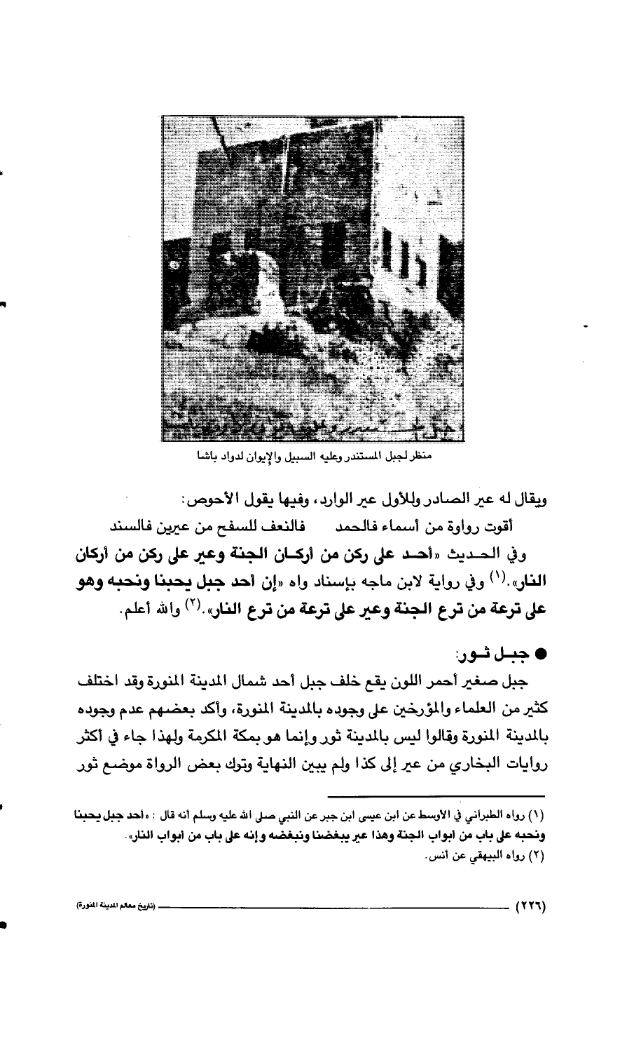 226…منظر لجبل المستندر وعليه السبيل والإيوان لداود باشا ويقال له عير الصادر وللأول عير الوارد، وفيها يقول الأحوص: أقوت رواوة من أسماء فالحمد فالعنف للسفح من عيرين فالسند وفي الحديث " احد على ركن من أركان الجنة وعير على ركن من أركان النار ". (1) وفي رواية لابن ماجه بإسناد رواه " إن أحد جبل يحبنا ونحبه وهو على ترعة من ترع الجنة وعير على ترعة من ترع النار ". (2) والله أعلم.